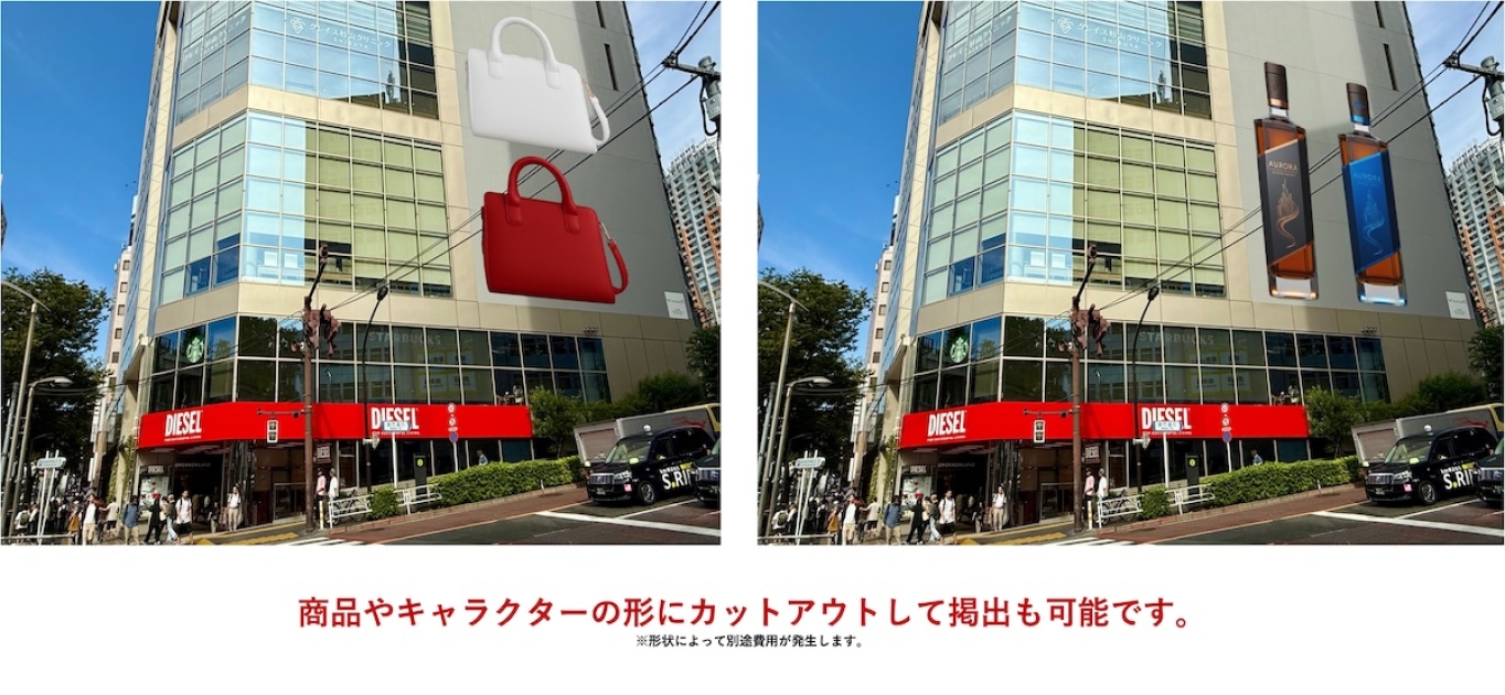 MIYASHITA PARKの近く、明治通り沿いに約100平米の巨大壁面広告が誕生 カットアウトなど特殊展開にも対応可能!