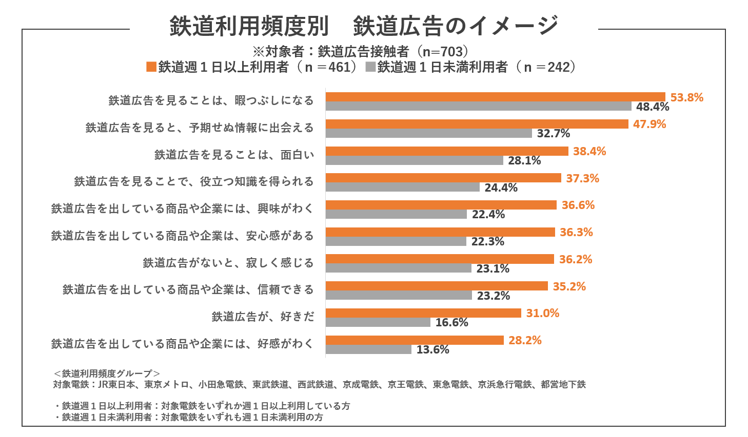鉄道広告接触者(n=703)の全体を、「鉄道利用週1日以上利用者」と「鉄道利用週1日未満利用者」の2つのグループに分けて、スコアを確認すると、鉄道広告のイメージは、前者において、おおむね高い傾向となりました。鉄道利用頻度が高いほど、鉄道広告に対して、好意的なイメージを抱いていることが分かります!
