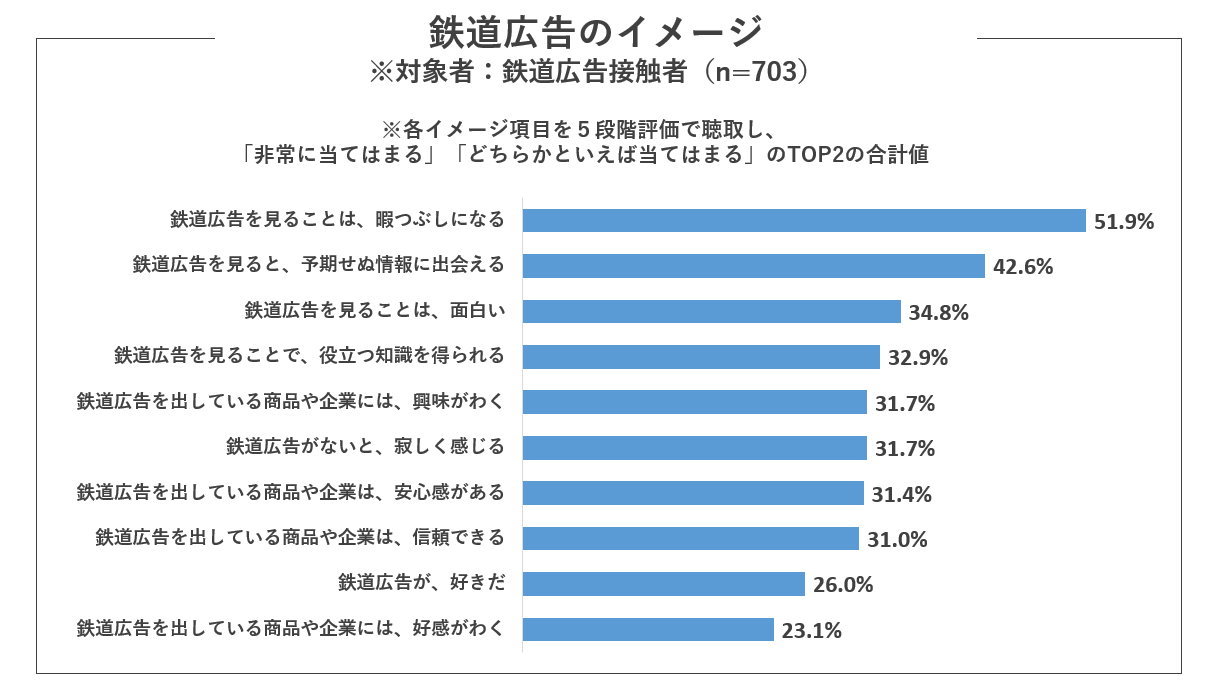 「暇つぶしになる」というイメージは、鉄道広告で51.9%となりました。