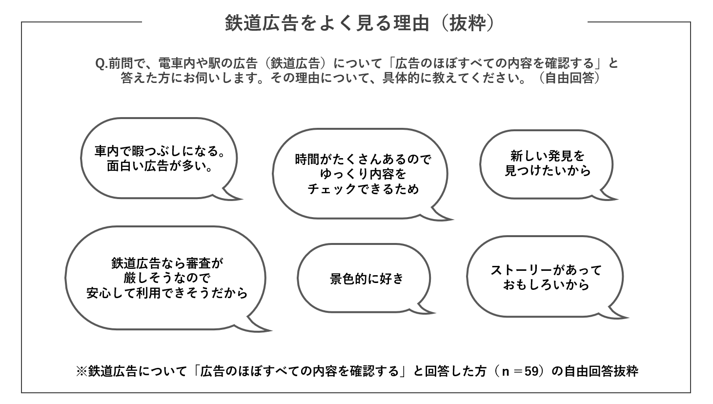 自由回答では、イメージ項目で挙げられていた「暇つぶし」や「新しい発見」のために、鉄道広告をよく見ているという回答や、「面白い」といった鉄道広告のクリエイティブ表現に関する回答が見られました。その他、安心感・日常の景色としての魅力も挙げられており、具体的に鉄道広告の強みが明らかになりました。