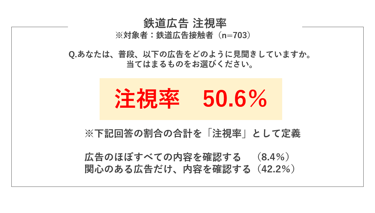 今回の調査では、各メディアの注視態度についても確認しました。鉄道広告について、「広告のほぼすべての内容を確認する」もしくは「関心のある広告だけ、内容を確認する」と回答した割合の合計は、50.6%でした。約半数の方が、鉄道広告の内容を確認していることが分かりました!