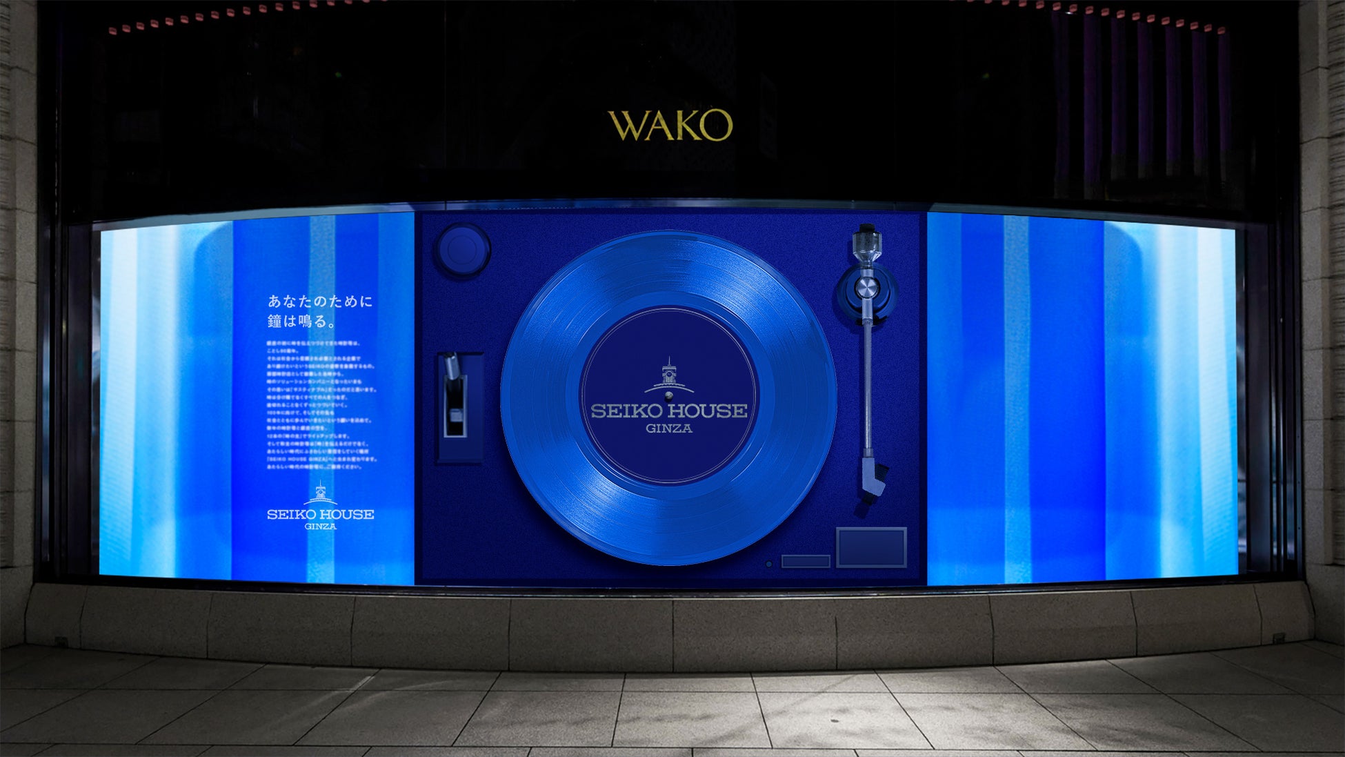 鐘の音と1階ウインドウディスプレイも連動し、また、夜間には建物をSEIKO HOUSE GINZAのシンボルカラーである青色にライトアップします。