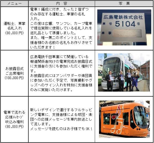 その他、「サンフレッチェ選手サイン入り試合球」、「トランルージュでのコンサート」、「広響・サンフレ・カープ電車、3車両並べての撮影会」や「5100形の吊り輪」など、グッズやイベントなど、多方面に渡る返礼品を30種類程度ご準備しております。(最小金額 1口3,000円~最高金額 1口100,000円を予定)