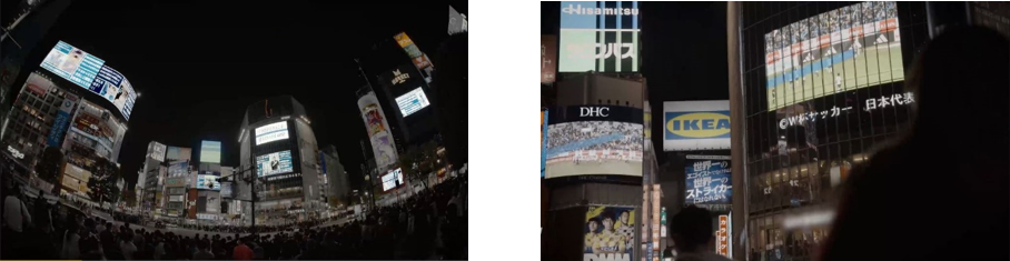 渋谷スクランブル交差点周辺の7つのビジョンをジャックする広告では、「つながるからこそ、超えていける」をコンセプトに、1つのゴールに向かってパスをつなぐSAMURAI BLUEのプレーを表現し、ゴールを決めた後は選手、スタッフ、観客がともに喜び合う姿を表現しました。