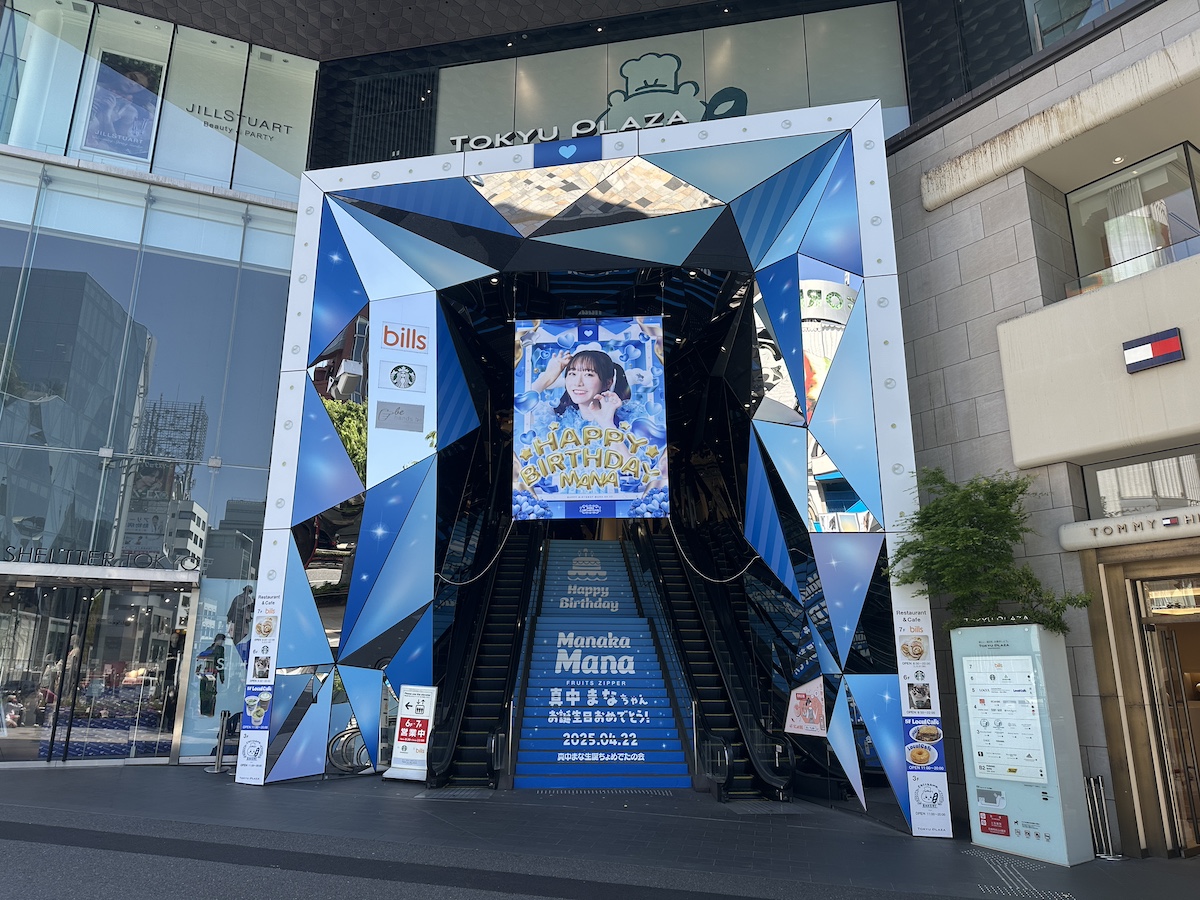 アイドルグループ「FRUITS ZIPPER」の真中まなさんの誕生日をお祝いする広告が、原宿エリアをジャックしていました。