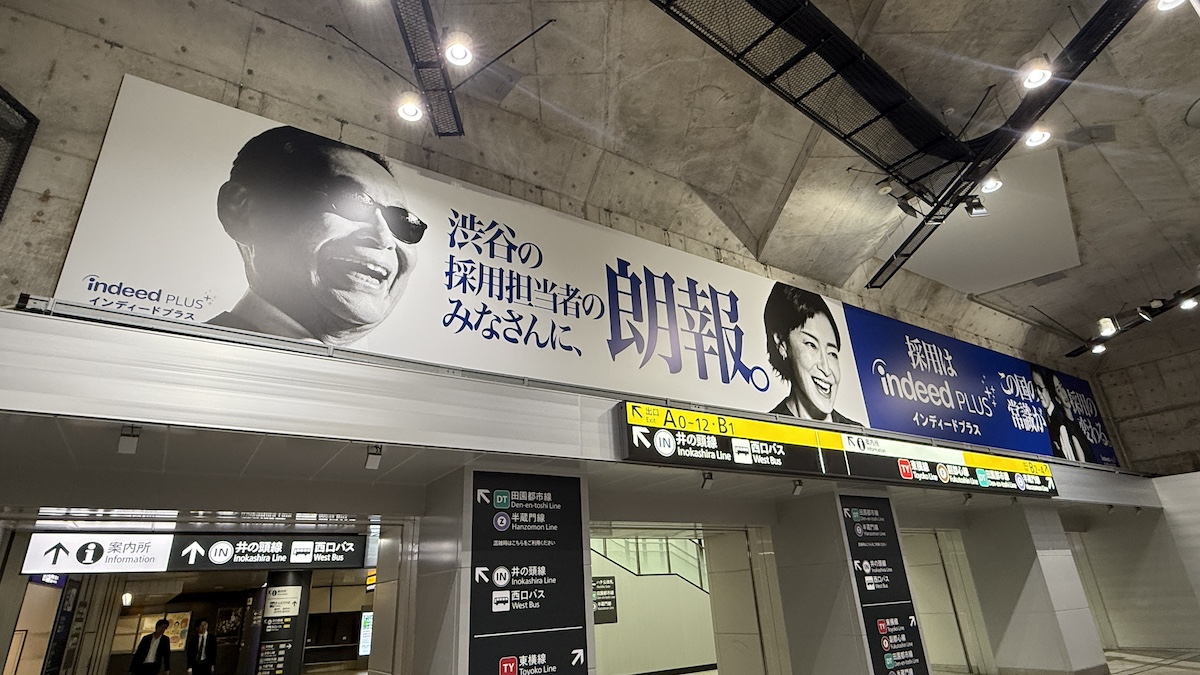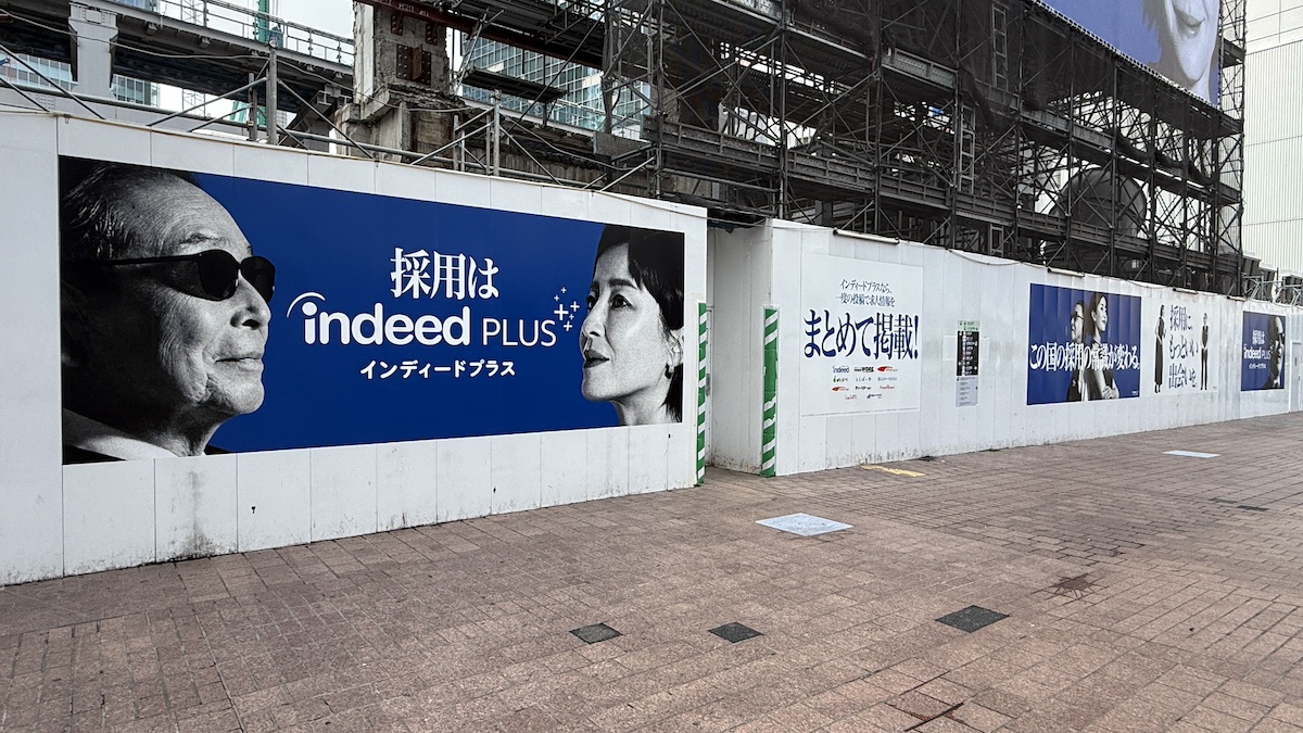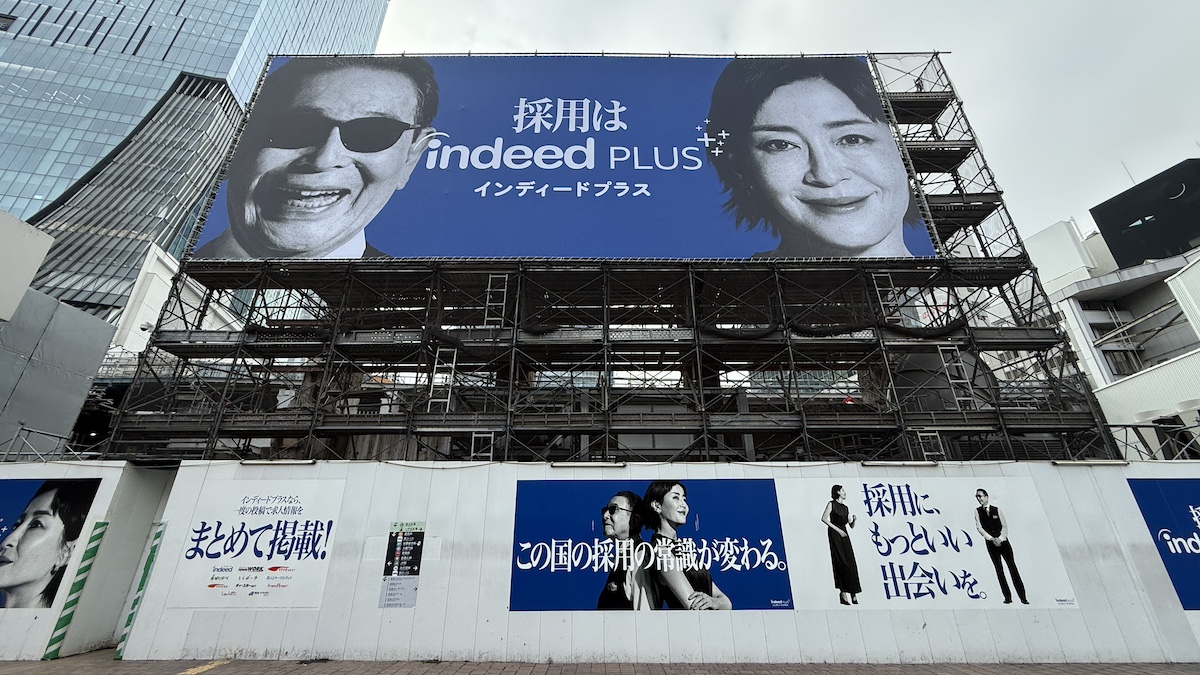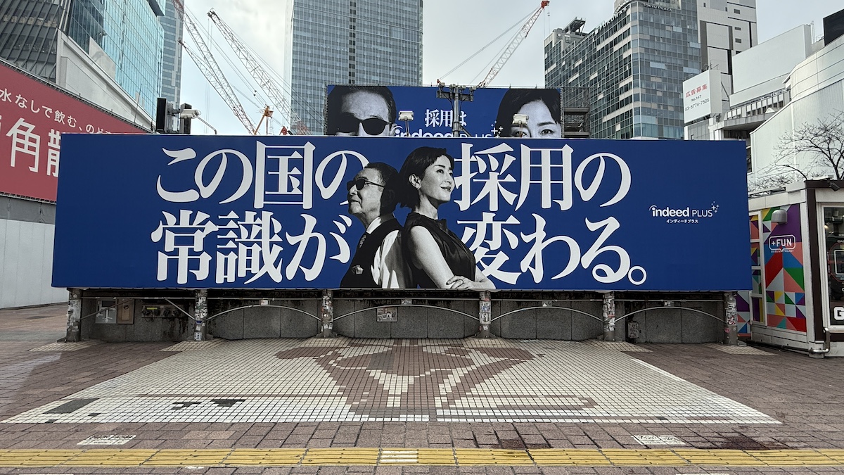 渋谷駅の東口や、ハチ公広場の巨大なシート広告がジャックされ、「渋谷の採用担当のみなさんに、朗報。」というキャッチコピーや、タモリさんと宮沢りえさんのビジュアルでIndeed Japan一色となっていました。