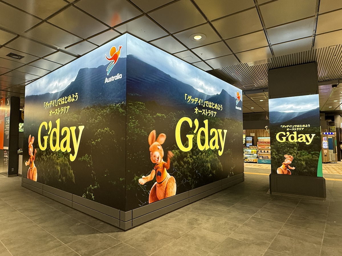 新宿南口と地下通路では、サイネージがジャックされ、オーストラリアの自然豊かな世界遺産、美味しいグルメなどをの映像をあばれる君がナレーションで紹介していました。