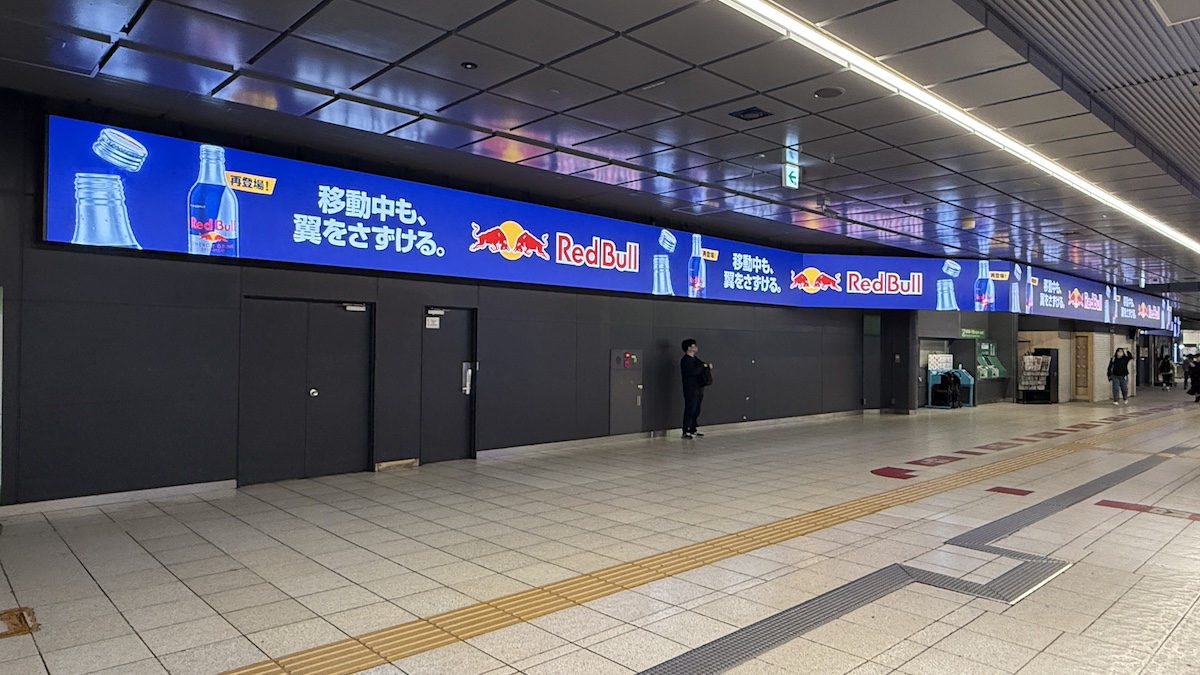 レッドブルは、2025年3月にRed Bull Athleteに就任したスケートボード選手の堀米雄斗さんを起用し、新宿駅で交通広告を実施しています。
