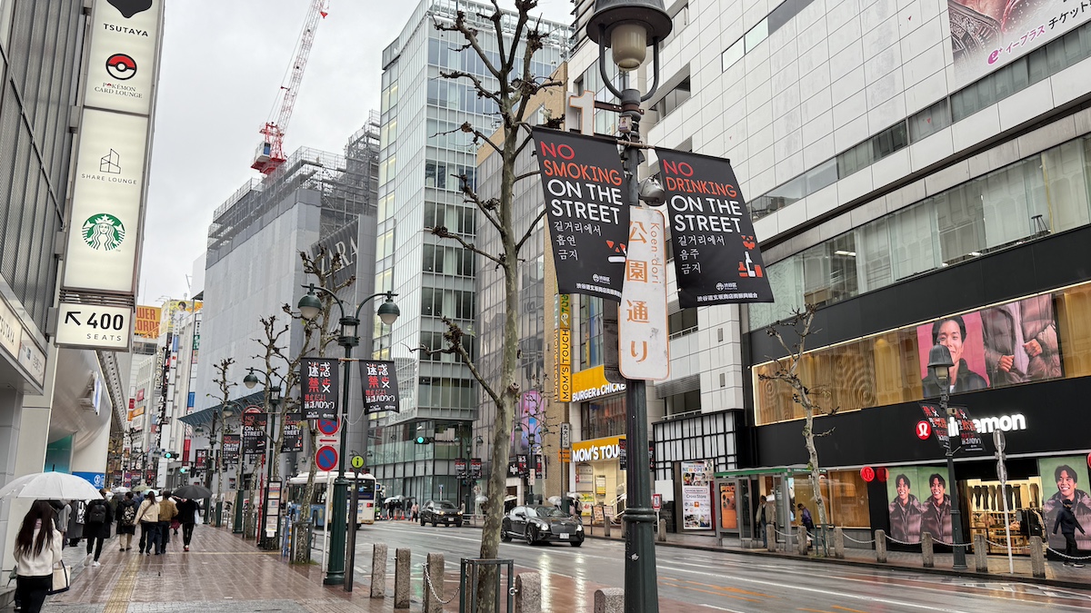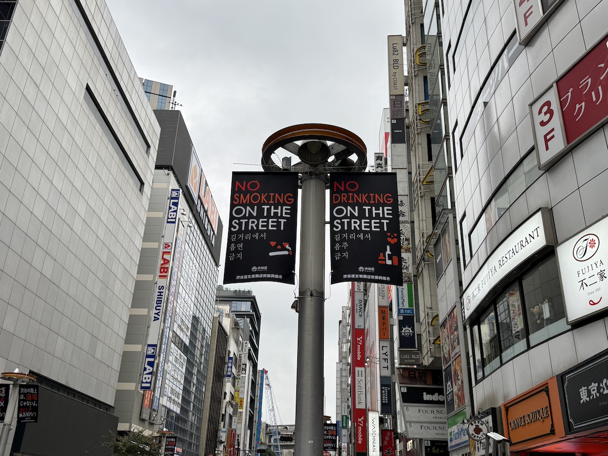 また、道玄坂や宮益坂の商店街でも、日本語や英語で注意喚起が書かれたフラッグ広告が掲出されていました。