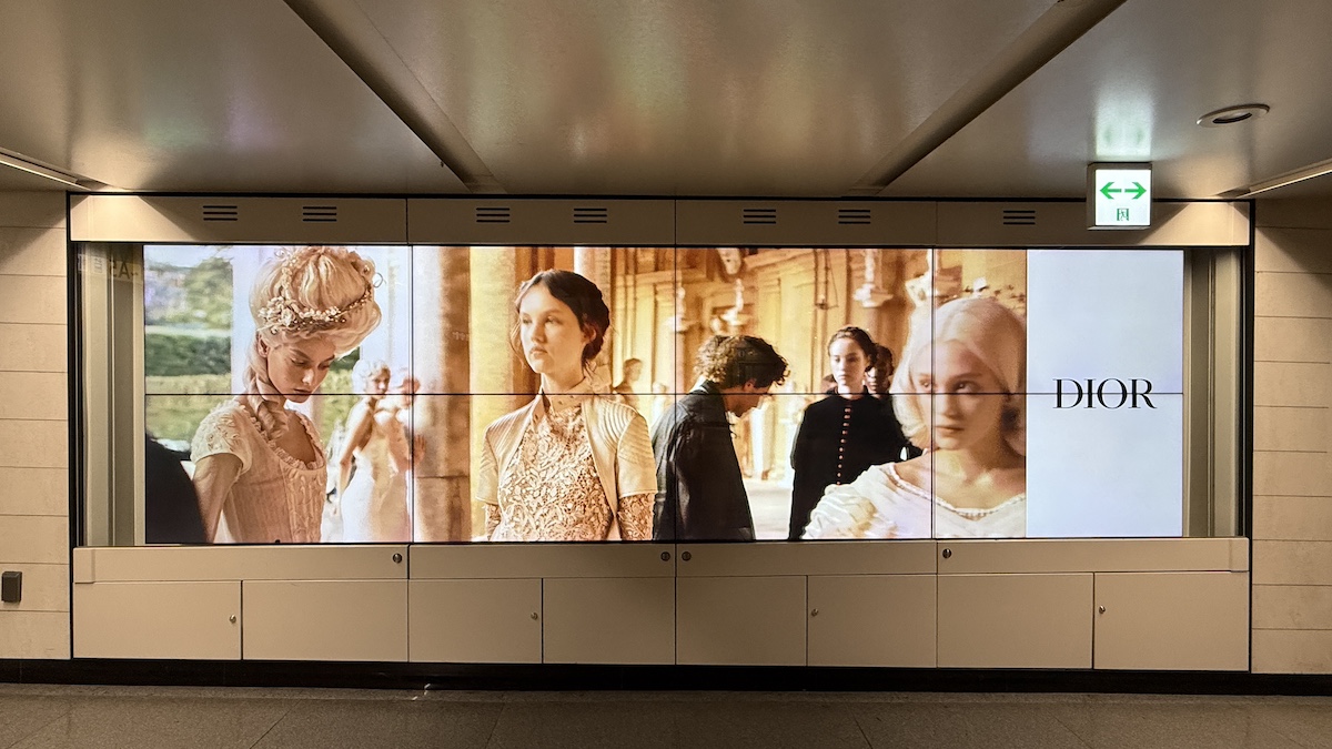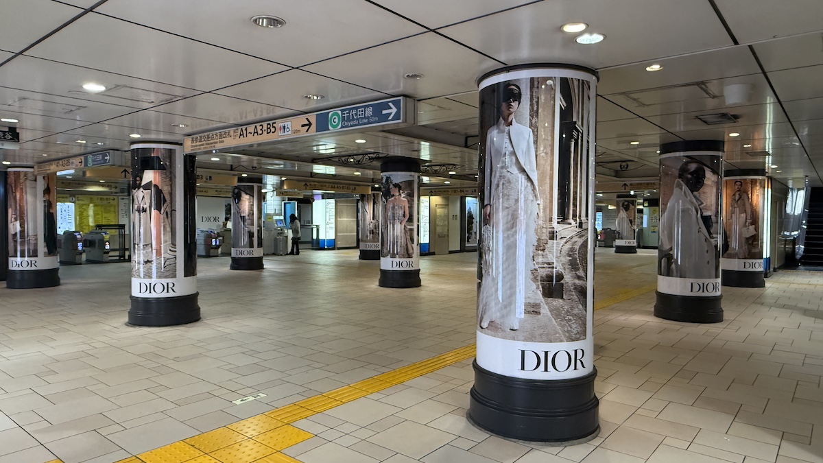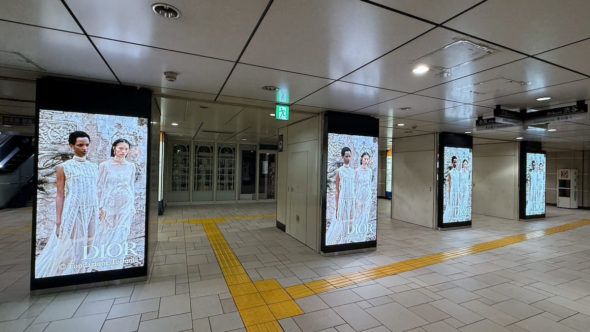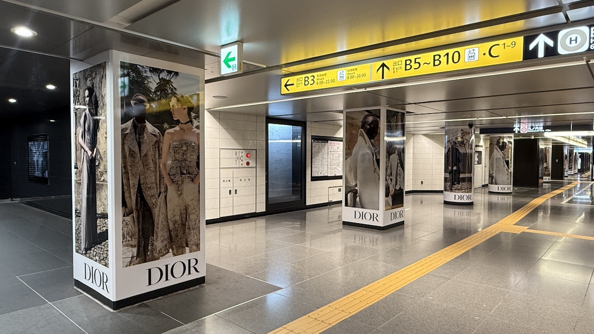 Diorは、先週の「レディディオールキャンペーン」に引き続き、2026年春夏クルーズコレクションのキャンペーンで、表参道駅・銀座駅をジャックしています。