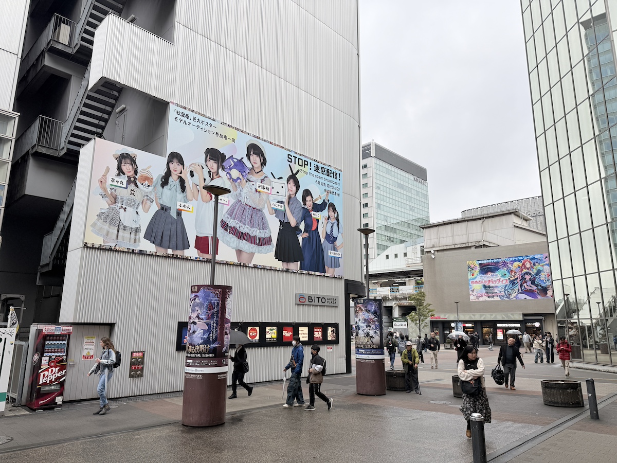 入賞した配信者100名のうち、上位7名の方が秋葉原駅の近くににある巨大広告「AKIHABARA WALL JACK」にメインモデルとして掲出され、残りの方々が上下に小さく掲出されていました。