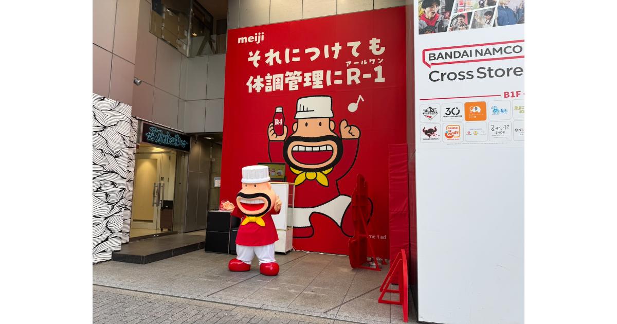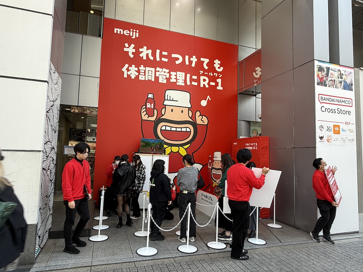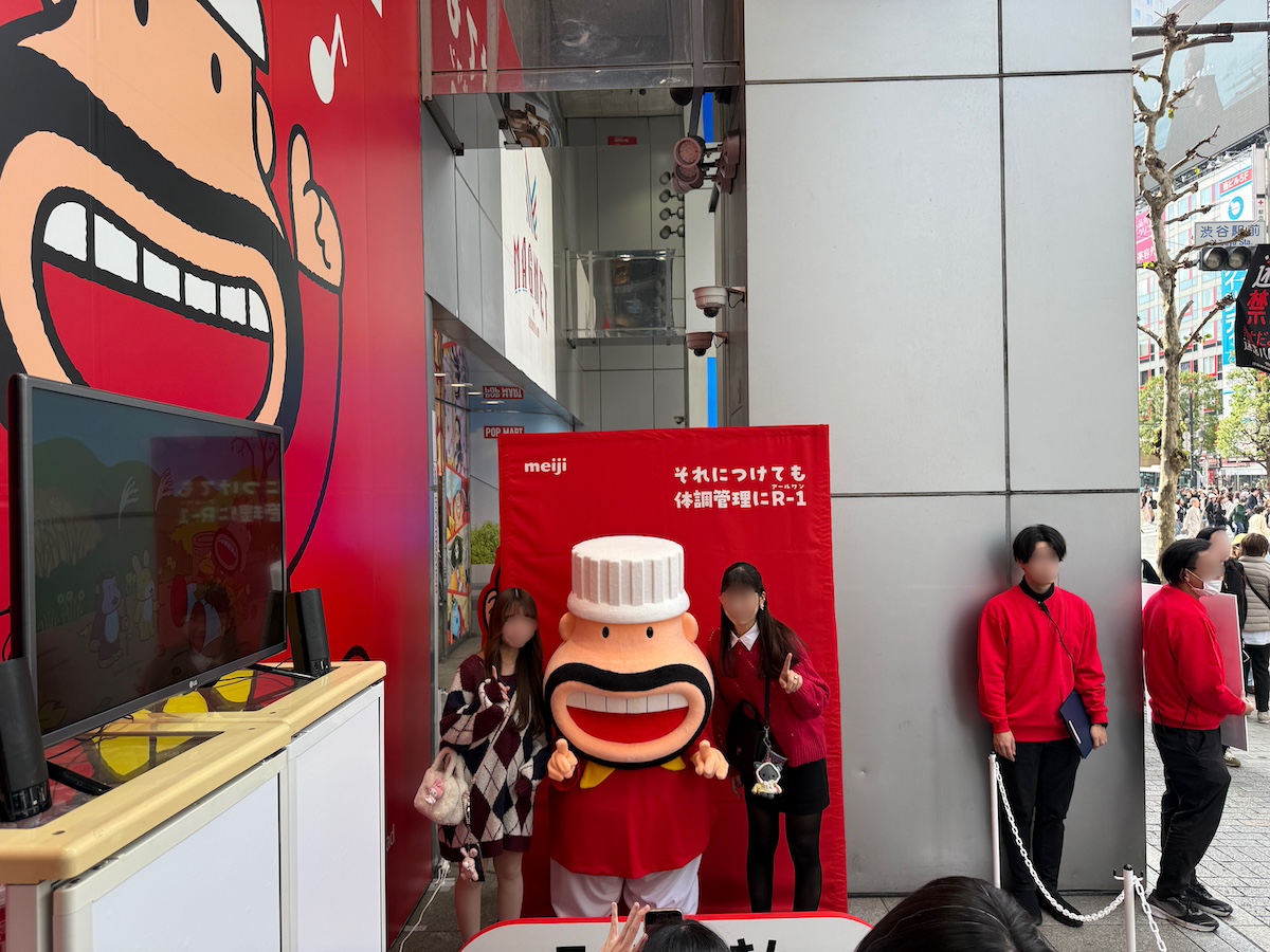 株式会社明治が販売している「明治プロビオヨーグルトR-1」は、新キャラクター「アールおじさん」の登場を記念し渋谷で巨大広告とお披露目イベントを行っていました。