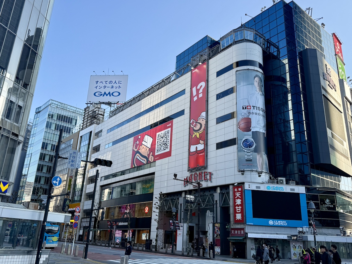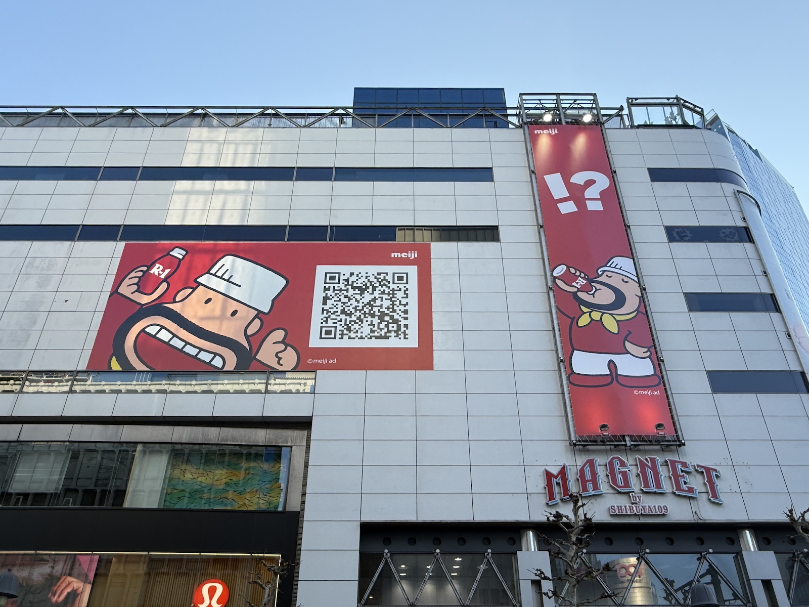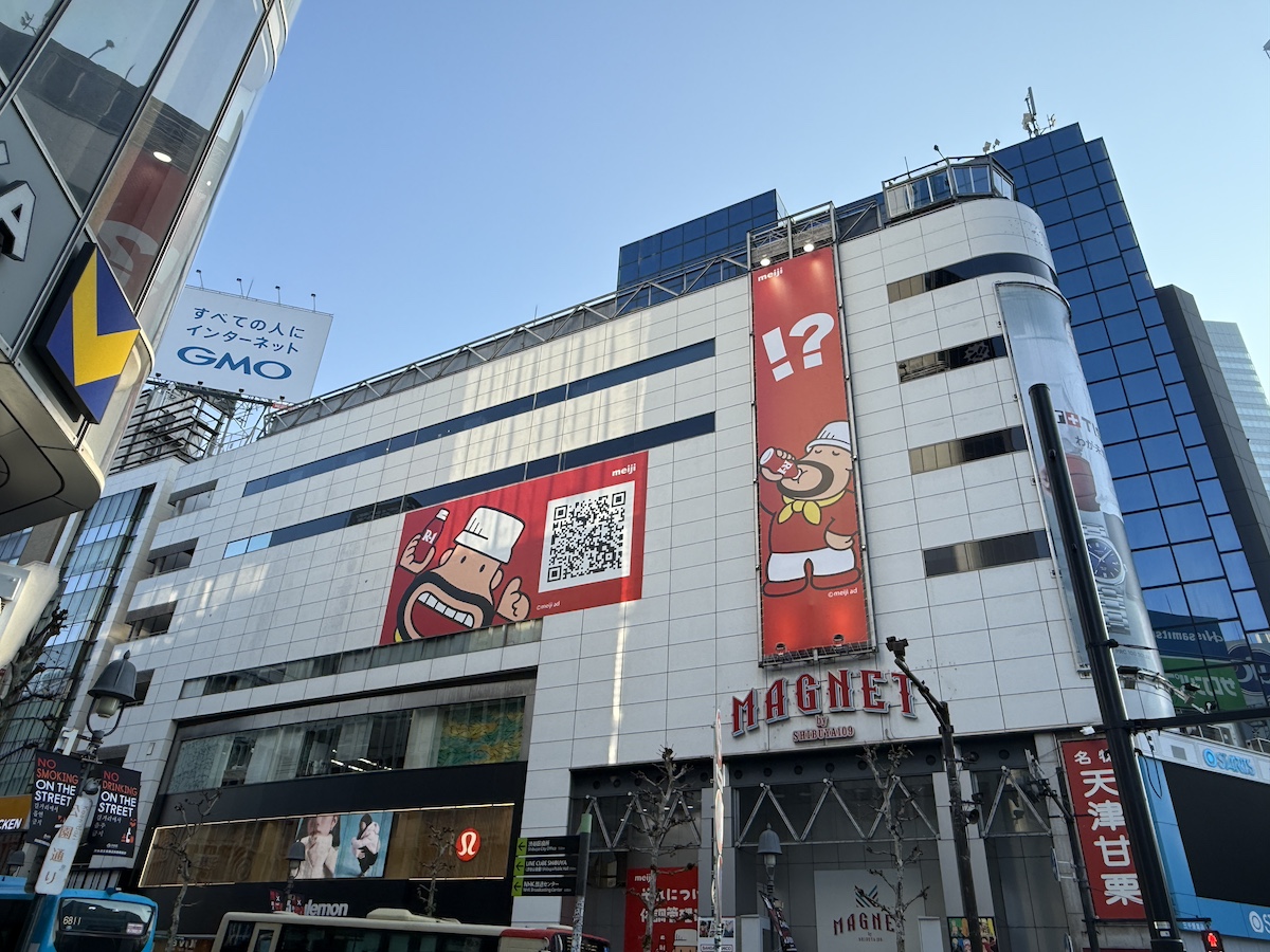 MAGNET by SHIBUYA109 の壁面には巨大なシート広告が掲出され、「アールおじさん」を起用した赤色のビジュアルが登場。