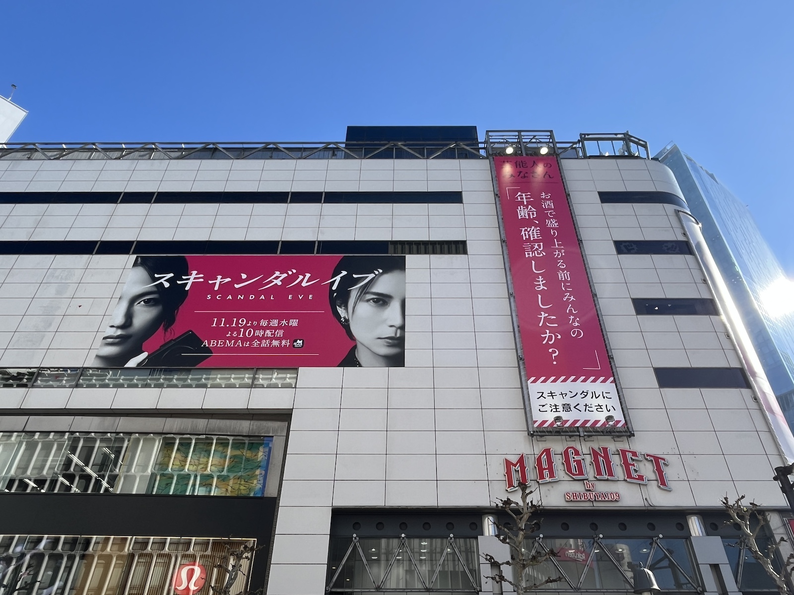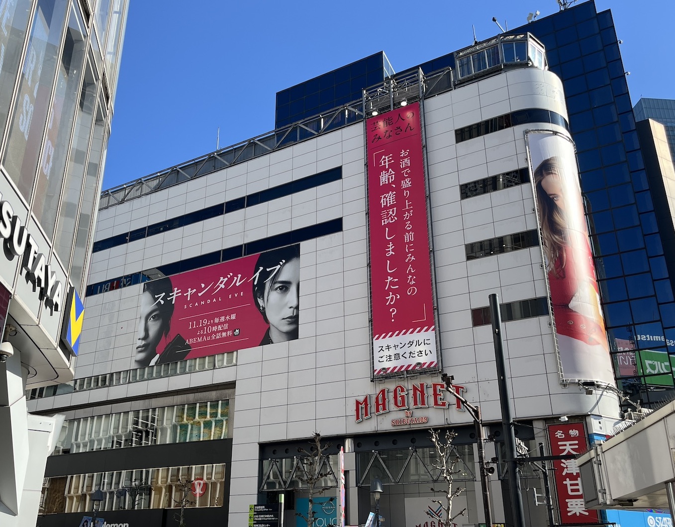 配信開始にあわせて、MAGNET by SHIBUYA109の壁面には巨大なシート広告とロングバナーが掲出され、主演の柴咲コウさんと川口春奈さんのビジュアルと、芸能人のみなさんに向けて「お酒で盛り上がる前にみんなの年齢、確認しましたか?」という注意喚起のキャッチコピーが展開されていました。