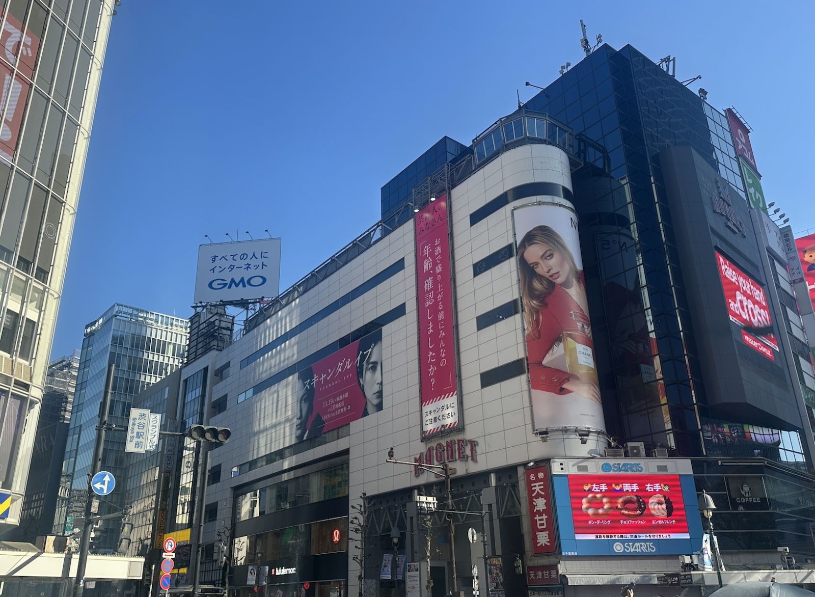 【渋谷】MAGNET by SHIBUYA109ウォールジャック配信開始にあわせて、MAGNET by SHIBUYA109の壁面には巨大なシート広告とロングバナーが掲出され、主演の柴咲コウさんと川口春奈さんのビジュアルと、芸能人のみなさんに向けて「お酒で盛り上がる前にみんなの年齢、確認しましたか?」という注意喚起のキャッチコピーが展開されていました。