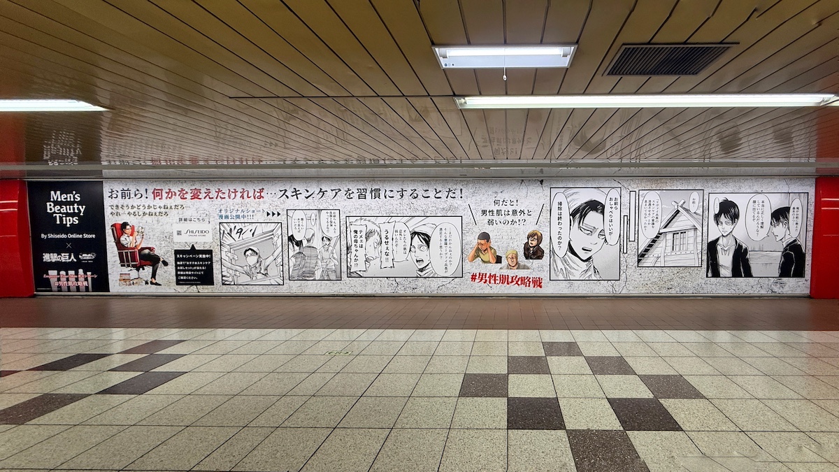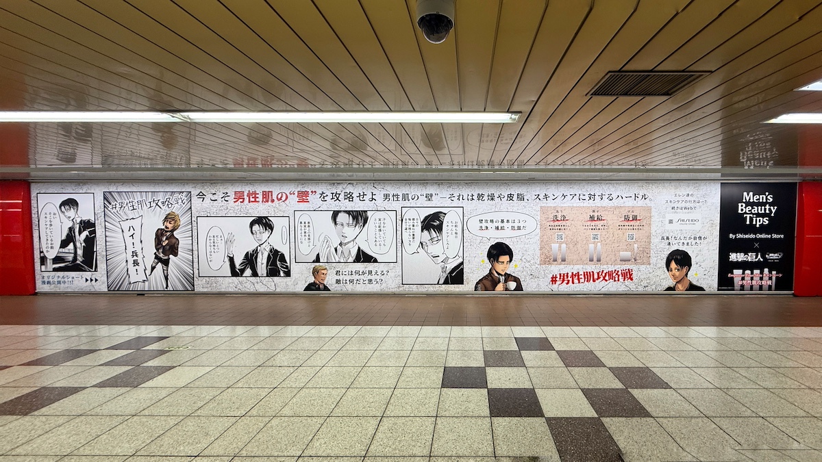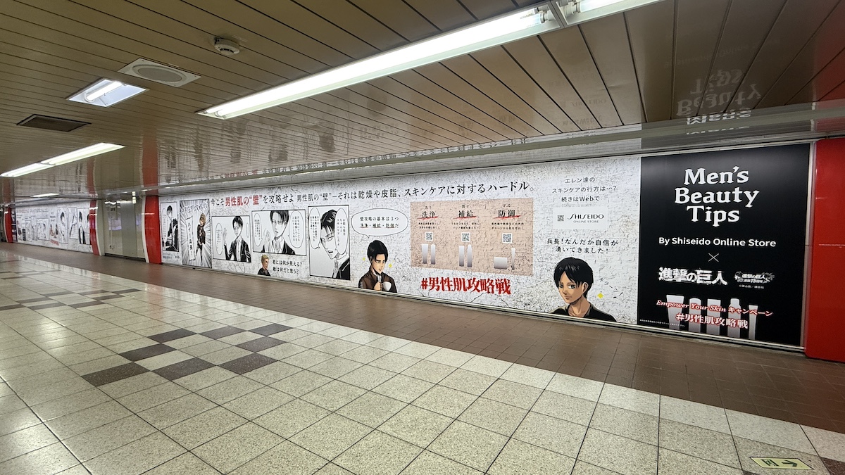 資生堂グループの公式ECサイト「資生堂オンラインストア(SHISEIDO ONLINE STORE)」が発信するメンズ美容情報コンテンツ『Men's Beauty Tips』と、人気漫画『進撃の巨人』がコラボレーションした『Empower Your Skinキャンペーン』が交通広告で実施されています。