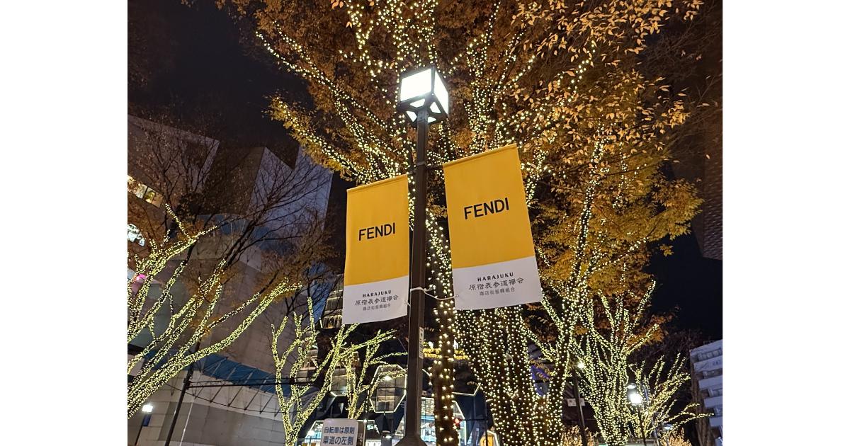 表参道沿いの約150本の欅の木や植栽帯が90万個の電球でライトアップされるイルミネーションの実施にあわせて、表参道や原宿の神宮前エリアではサイネージや街灯フラッグなどを実施していました。
