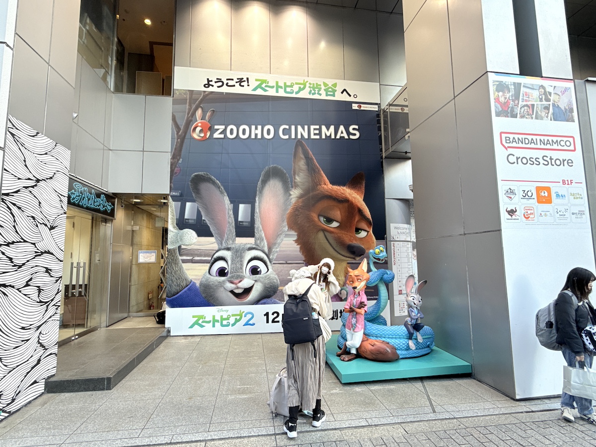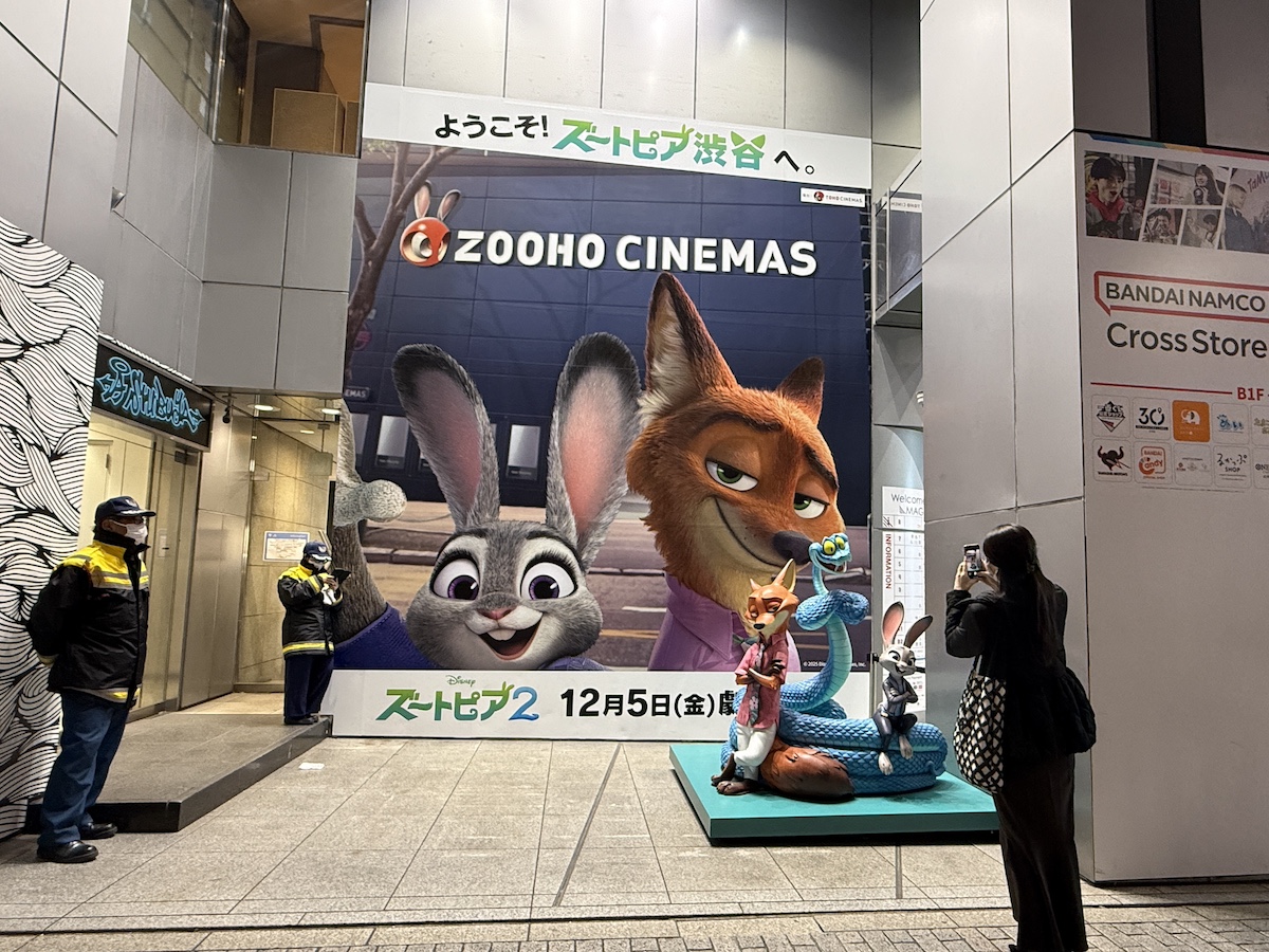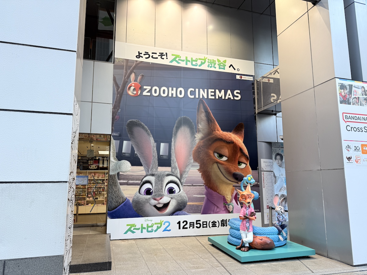 「ZOOHOシネマズ(TOHOシネマズのパロディ)」を背景にジュディ・ホップス&ニック・ワイルドの巨大ビジュアルが掲出されていました。