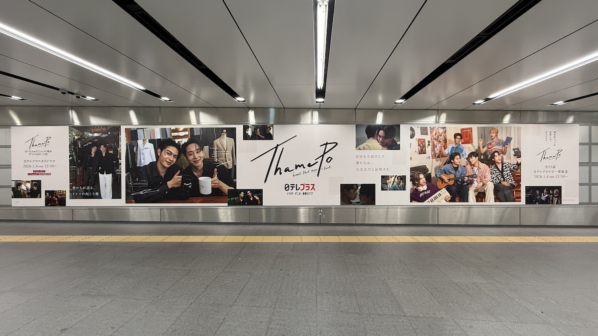 配信にあわせて、渋谷駅の地下通路にある巨大なシート広告ではドラマの告知と、日テレプラスオリジナルの主演William&Estによるナビ番組「「ThamePo -Heart That Skips a Beat-」William&Estが語るドラマの向こう側」の告知を行っていました。