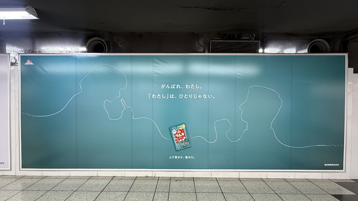 新宿駅の地下通路にあるシート広告では、絵が描かれた332粒のラムネと「がんばれ、わたし。「わたし」は、一人じゃない。」というキャッチコピーとアニメーションムービーのQRコードがデザインとなっていました。