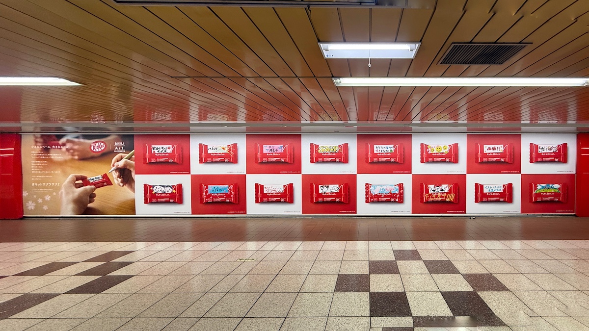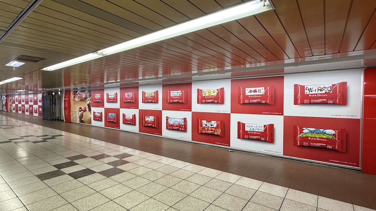 新宿駅の地下通路には巨大なシート広告か掲出され、日大芸術学部の学生が思い思いの応援メッセージを描いたキットカットがずらりと並んだデザインとなっていました。