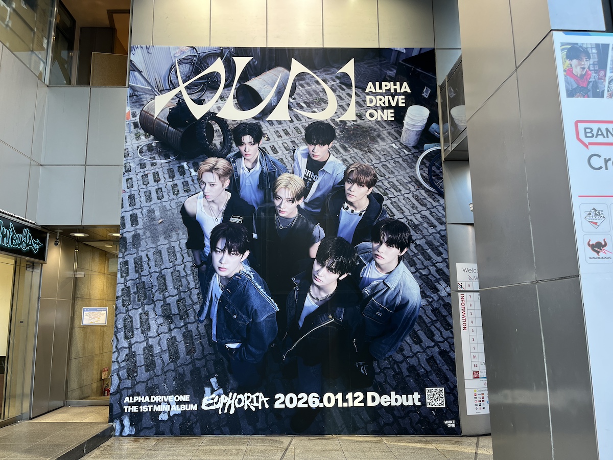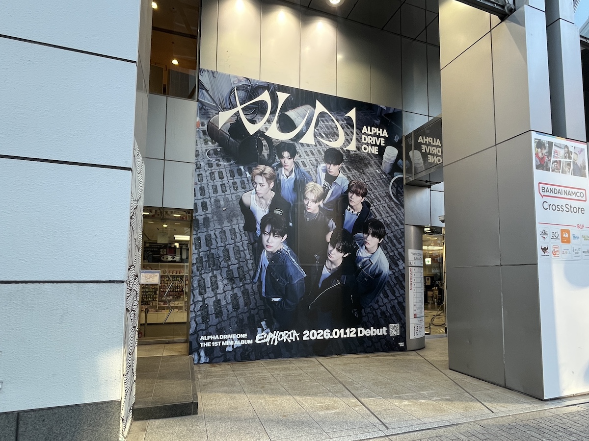 韓国の8人組ボーイズグループ、「ALPHA DRIVE ONE」が、1stミニアルバム「EUPHORIA」のリリースを記念し渋谷で屋外広告を実施しています。