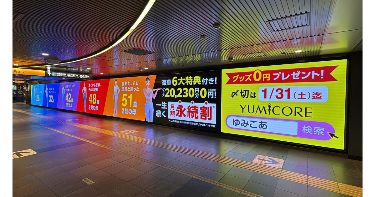 渋谷駅の地下通路にある巨大なデジタルサイネージがジャックされ、「何歳でも、骨からボディメイク!」というキャッチコピーや、現役トレーナーの方々や割引特典などがビジュアルとなっていました。