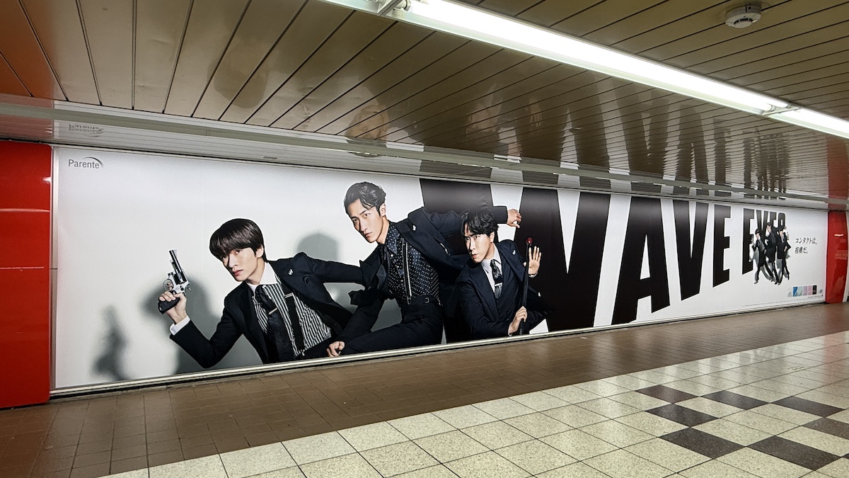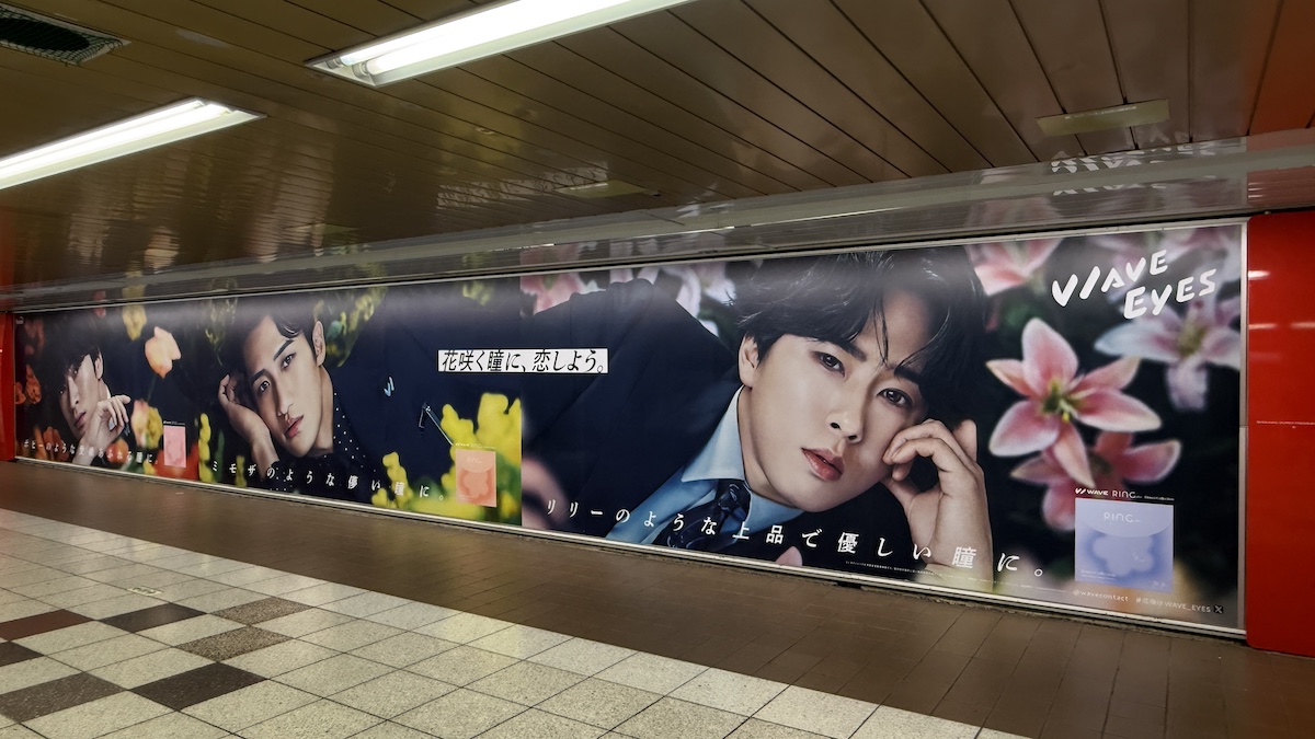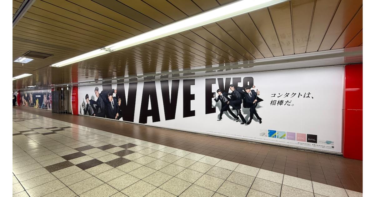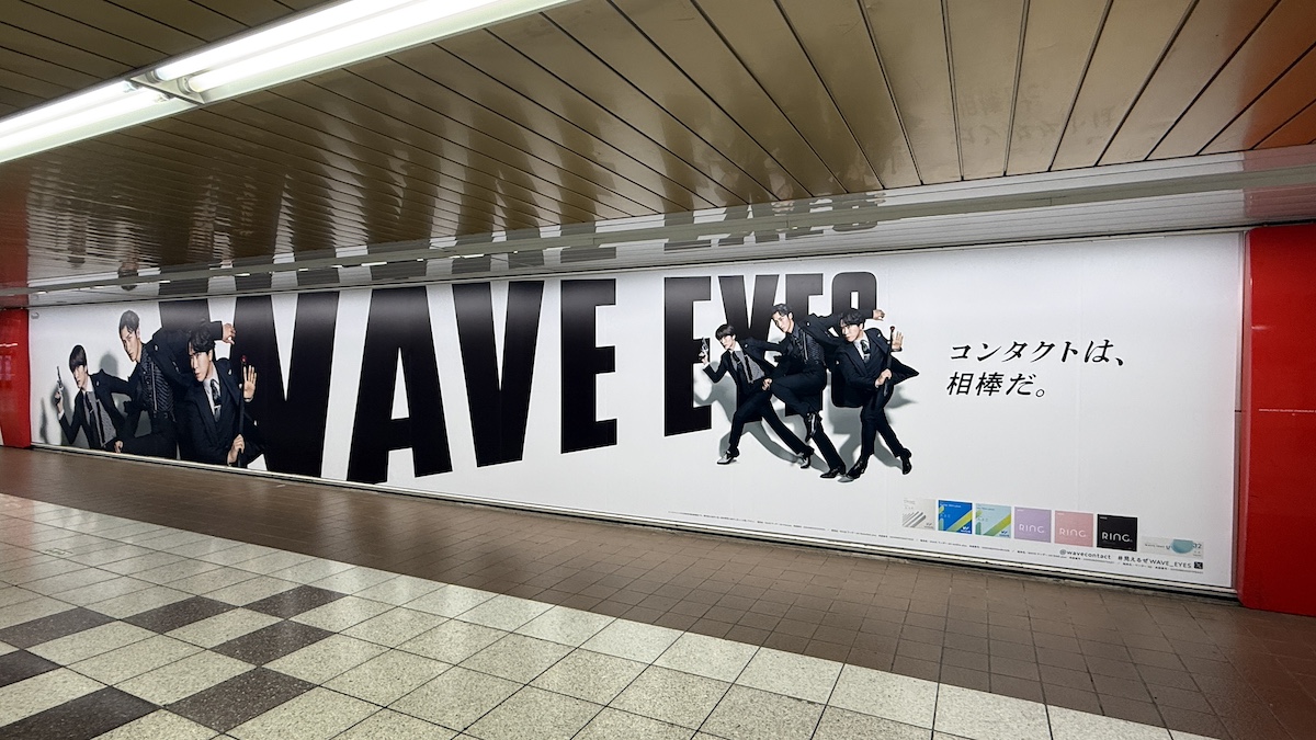 新宿駅の地下通路には巨大なシート広告が掲出され、1面は「コンタクトは、相棒だ。」というキャッチコピーとシークレット・エージェントチーム”WAVE EYES”に扮した3名のビジュアル、もう1面は「花咲く瞳に、恋しよう。」というキャッチコピーと屋敷の庭園でコンタクトをつけて張り込み中の姿がビジュアルとなっていました。