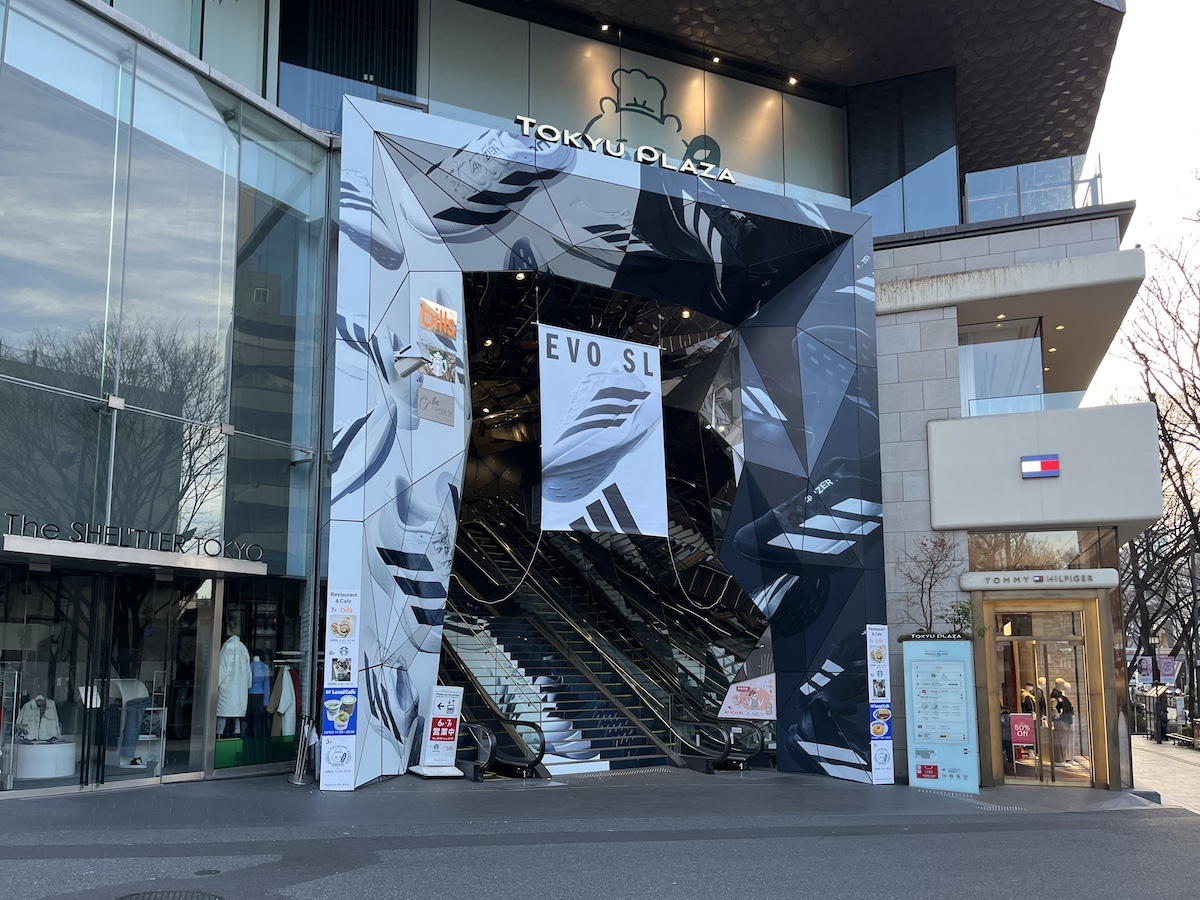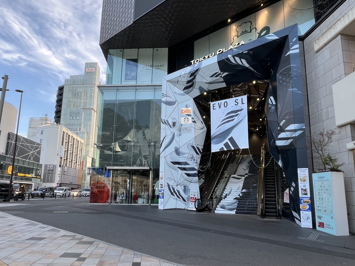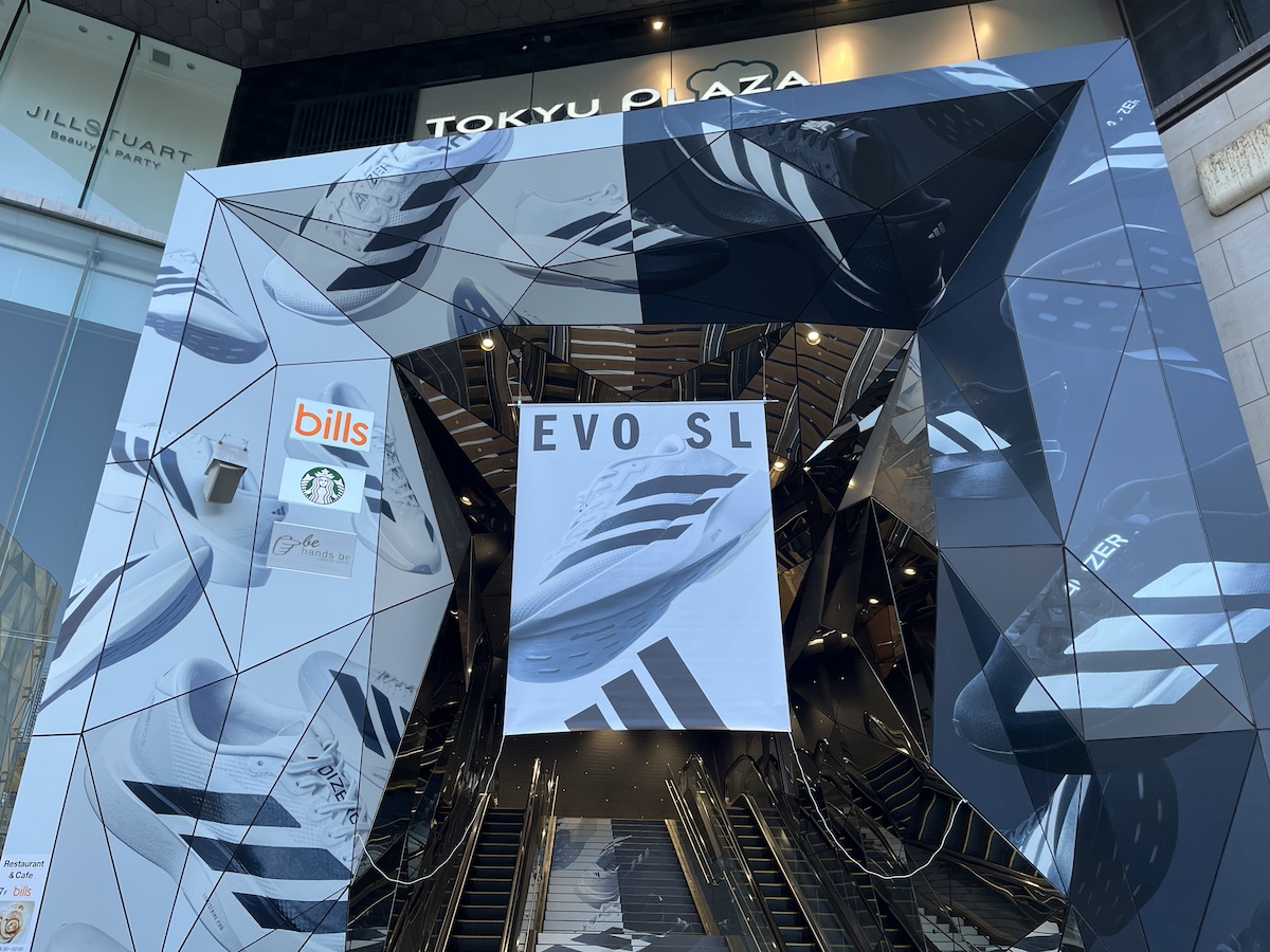 adidasは ランニングシューズ「ADIZERO(アディゼロ)」シリーズ の最新モデル「Evo sl」の発売を記念して、東急プラザ「オモカド」のエントランスをジャックしています。