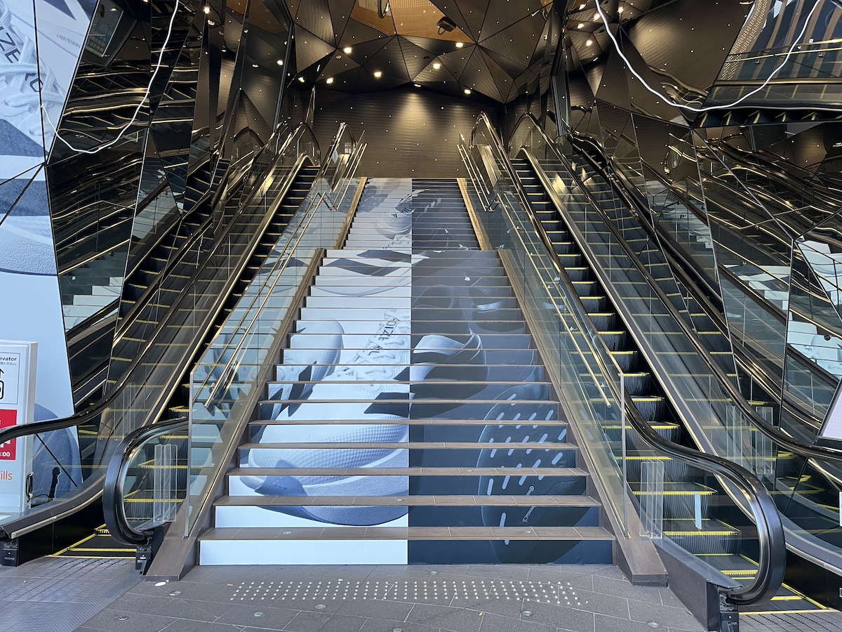 オモカドのエントランスにある階段やフラッグ、鏡面が、新色のブラックとホワイトのアイコンカラーを貴重にしたデザインとなっていました。