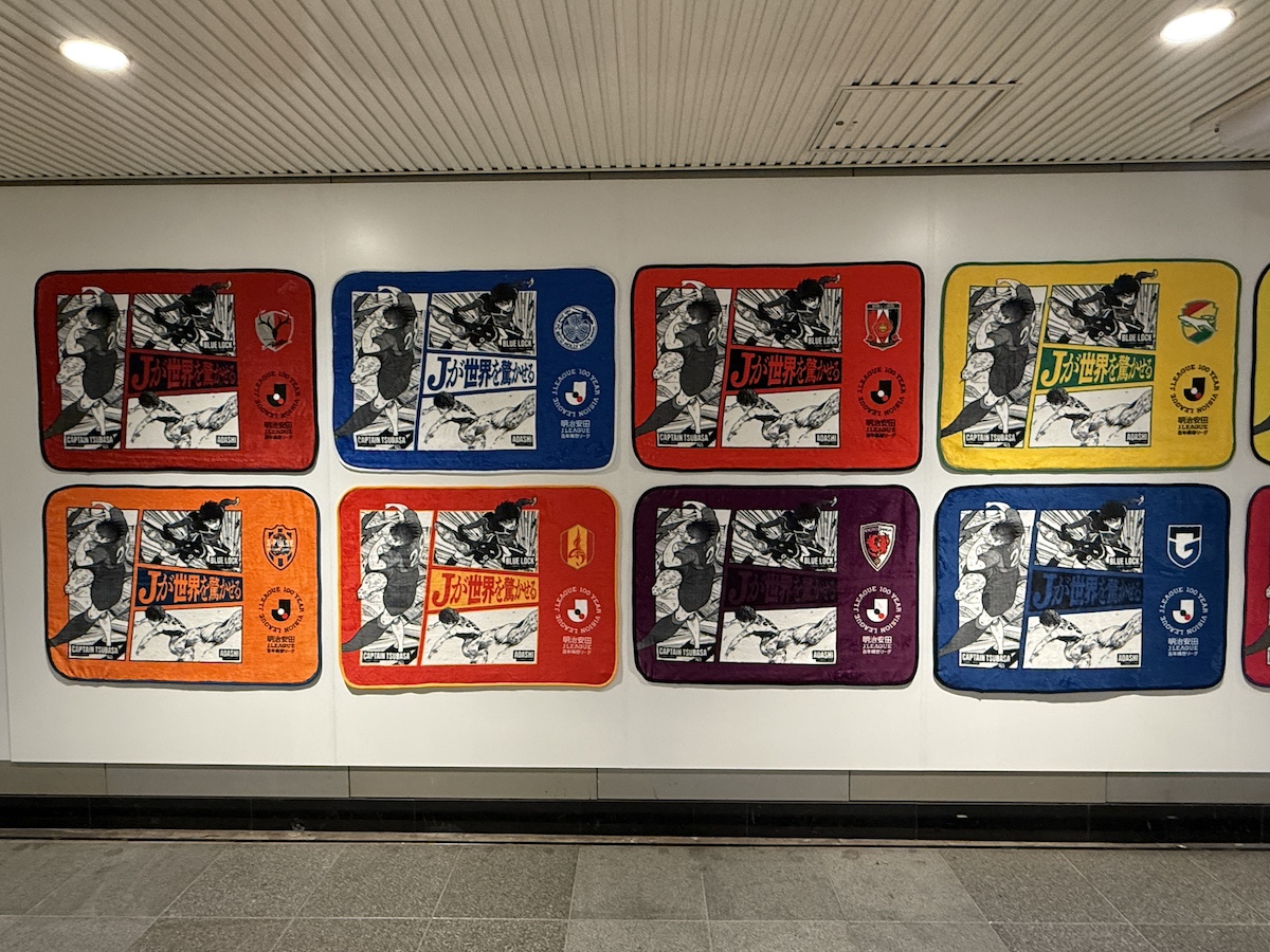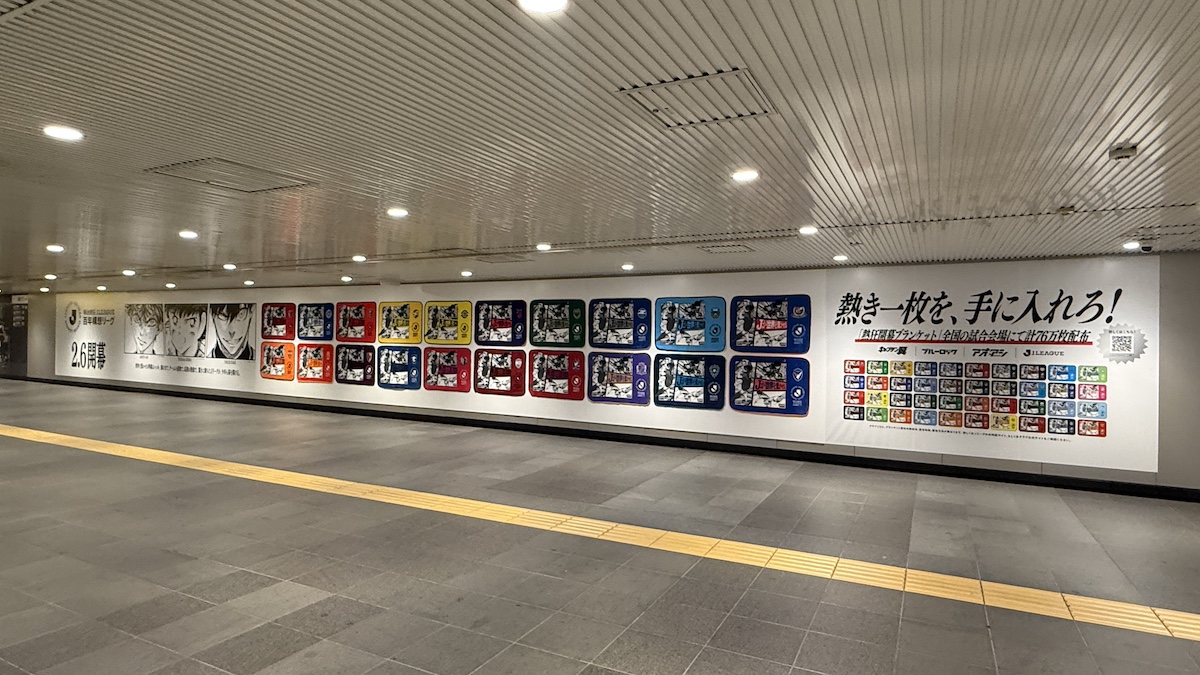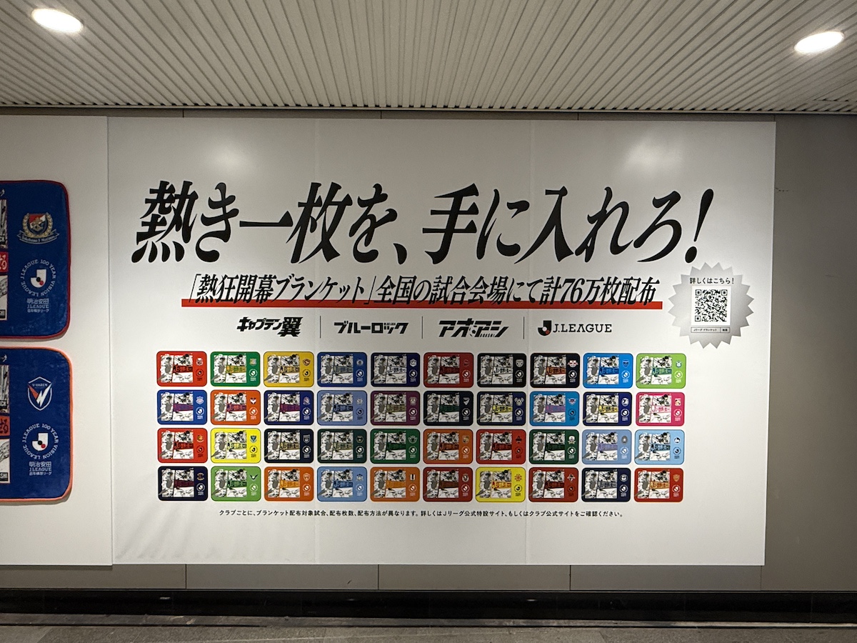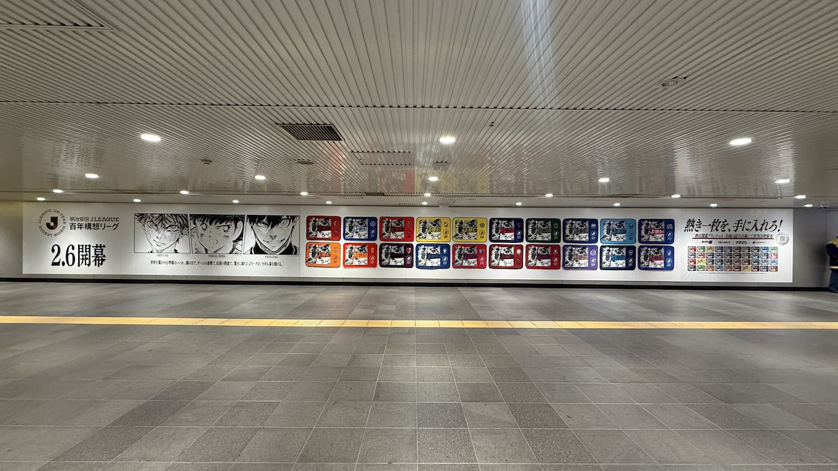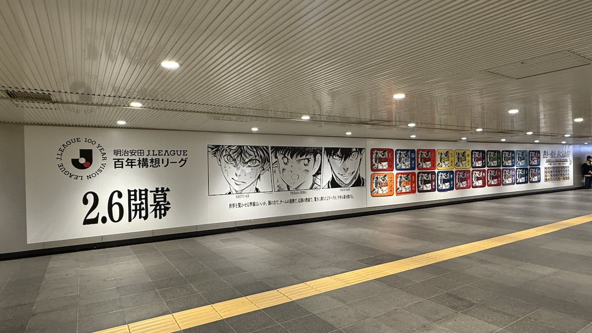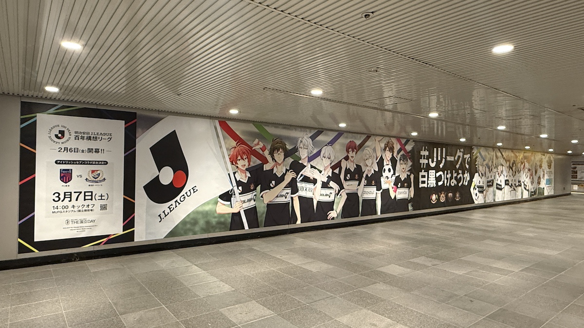 明治安田Jリーグ百年構想リーグの開幕に先駆け、アプリゲーム「アイドリッシュセブン」に登場するアイドルグループとのコラボ広告を渋谷駅で実施していました。
