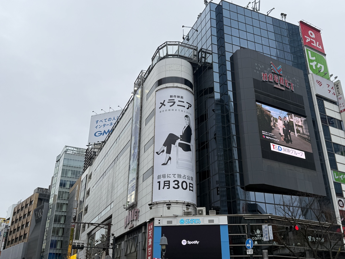 渋谷のスクランブル交差点には巨大なシート広告が登場し、メラニアさんの姿が白黒で描かれたキービジュアルが掲出されていました。