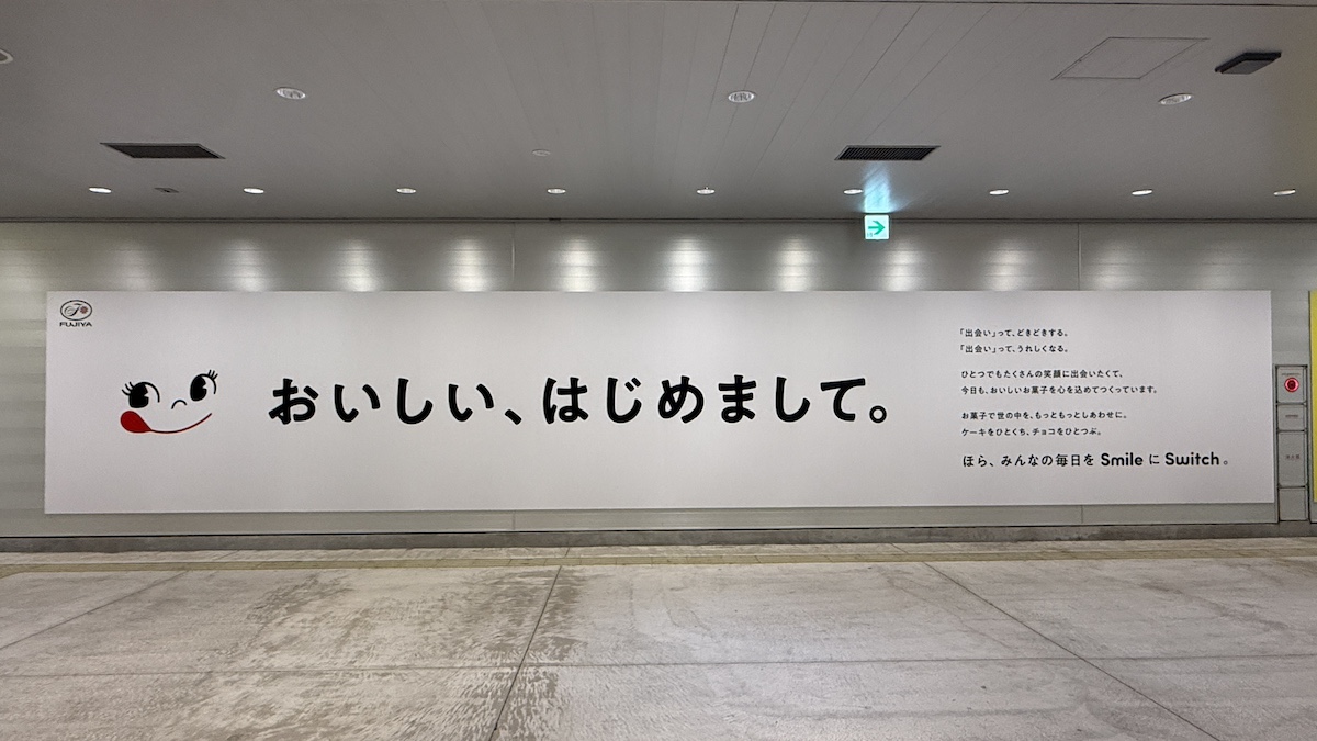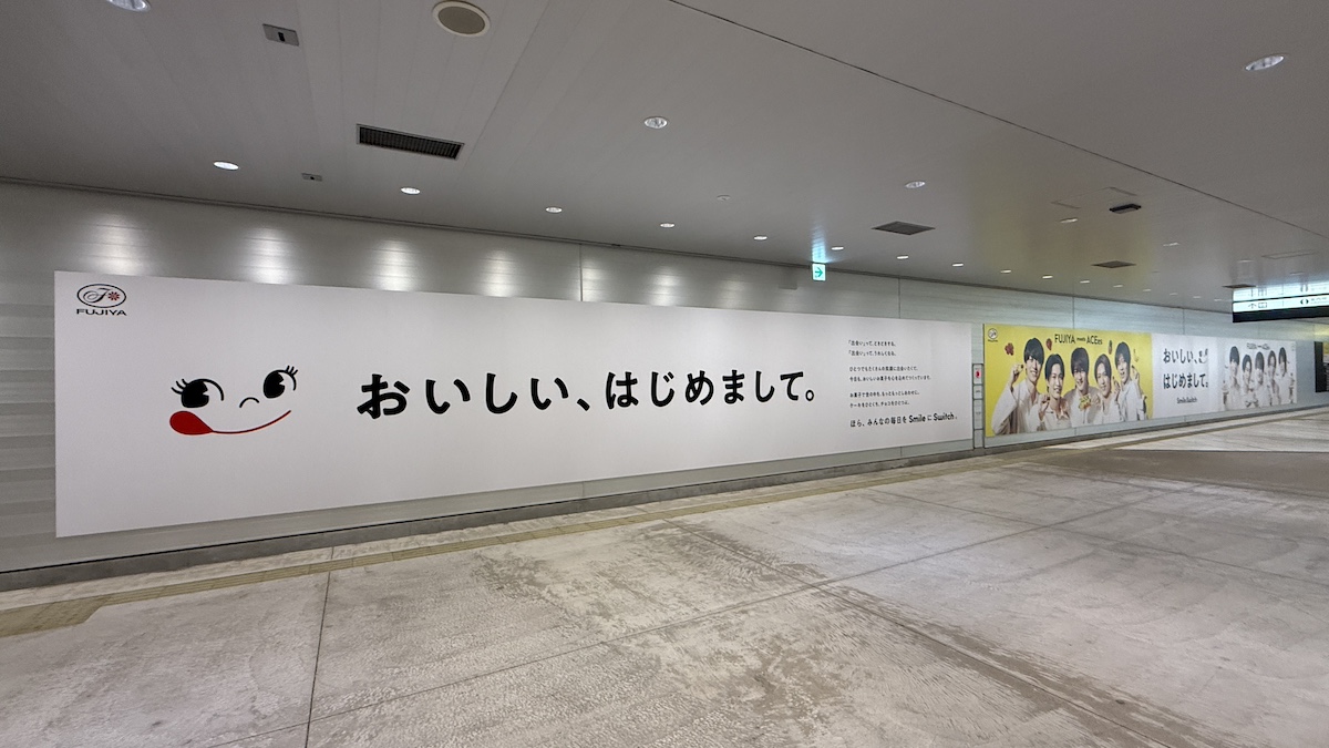 東口の地下通路には巨大なシート広告が登場し、「おいしい、はじめまして。」というキャッチコピーと、ルックチョコレートやケーキを手にしたメンバーの方のビジュアルが掲出されていました。