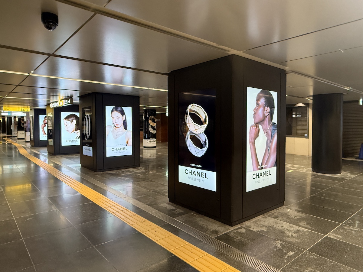 銀座駅と表参道駅にあるシート広告やアドピラー、サイネージがジャックされ、メゾンのアンバサダーを務めるBLACKPINKのジェニーさんやグレイシー・エイブラムスさんがココクラッシュのジュエリーを着用したキービジュアルが展開されていました。