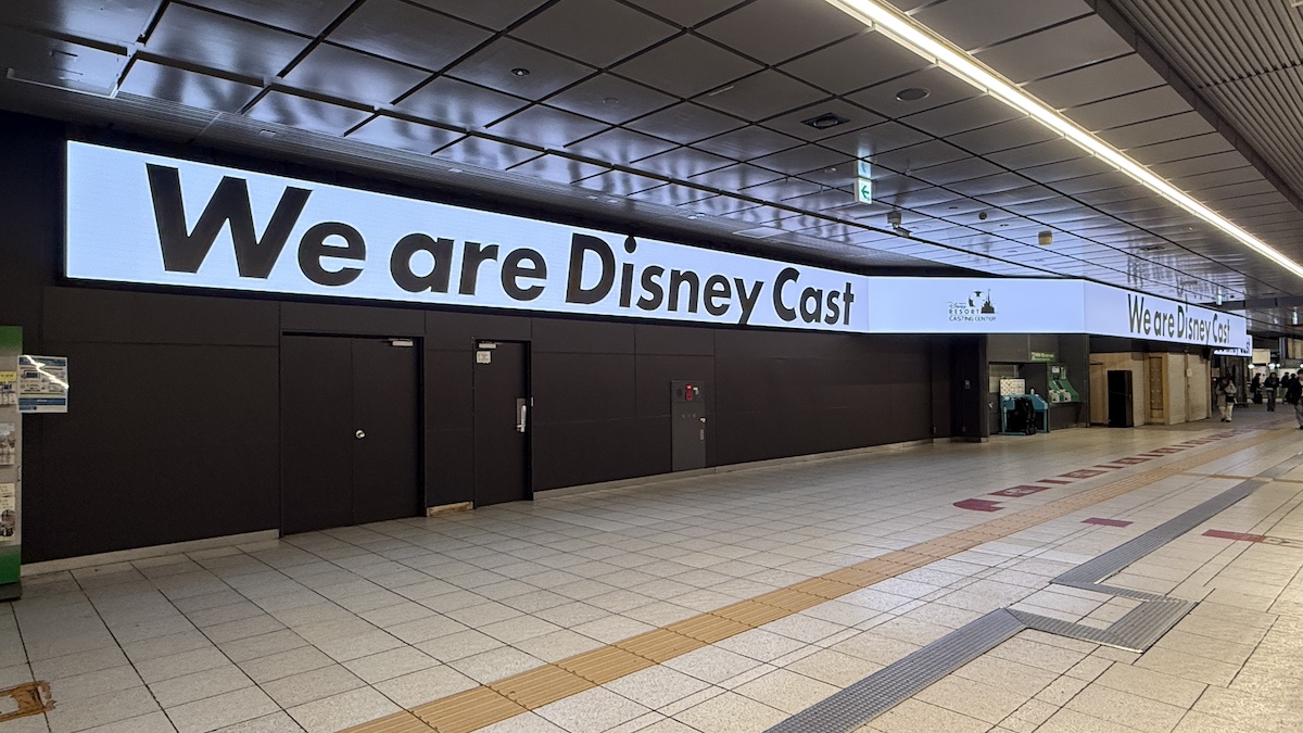 南口や地下通路のサイネージがジャックされ、「We are Disney Cast」というキャッチコピーとキャストの方々が働く姿が、黒を基調とした背景の中ドラマティックに描かれていました。