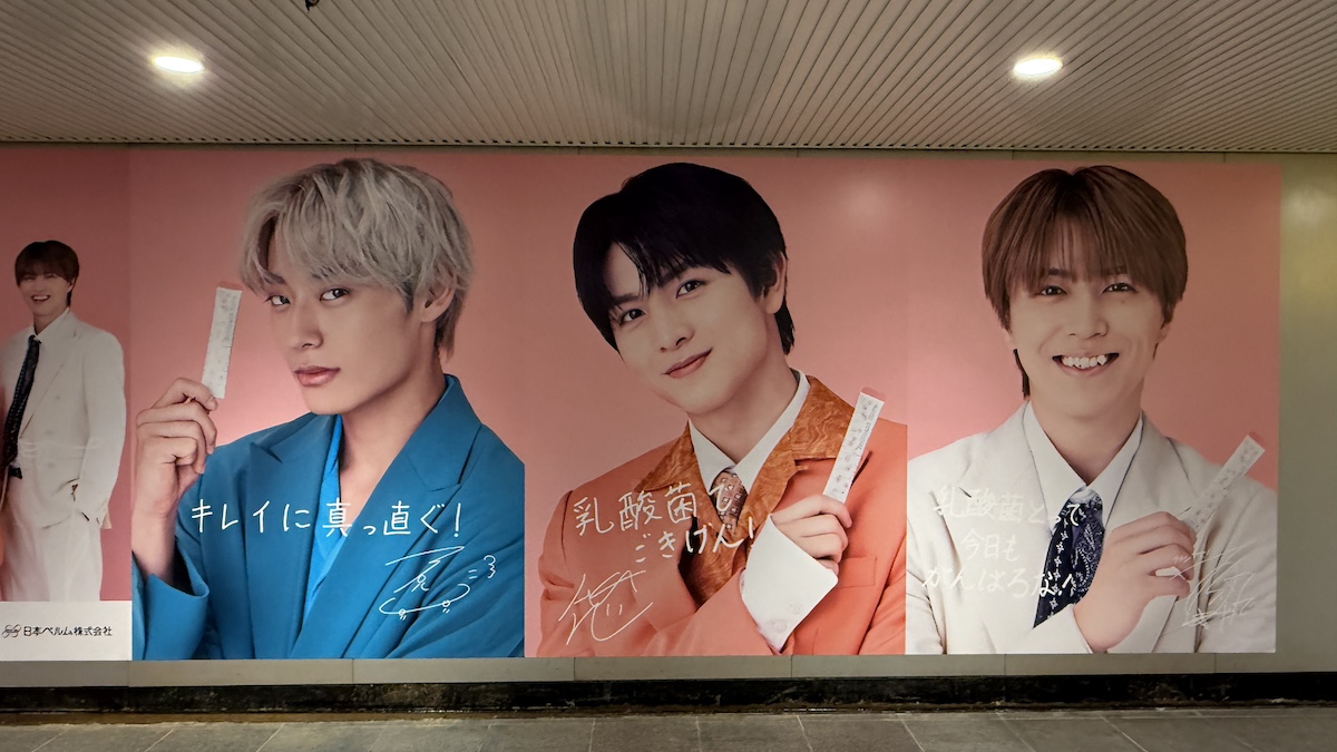 発売を記念し、渋谷駅の地下通路には巨大なシート広告が登場。商品アンバサダーにも就任した「超特急」のグループショットや、各メンバーが承認を手にしている姿がビジュアルとなっており、多くのファンの方が写真撮影を行っていました。